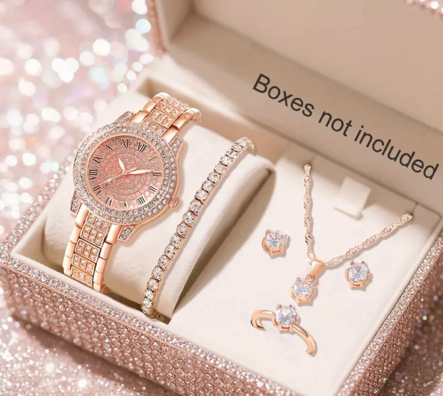 Rose Gold Watch, Bracelet, Ring, Necklace & Earring Set