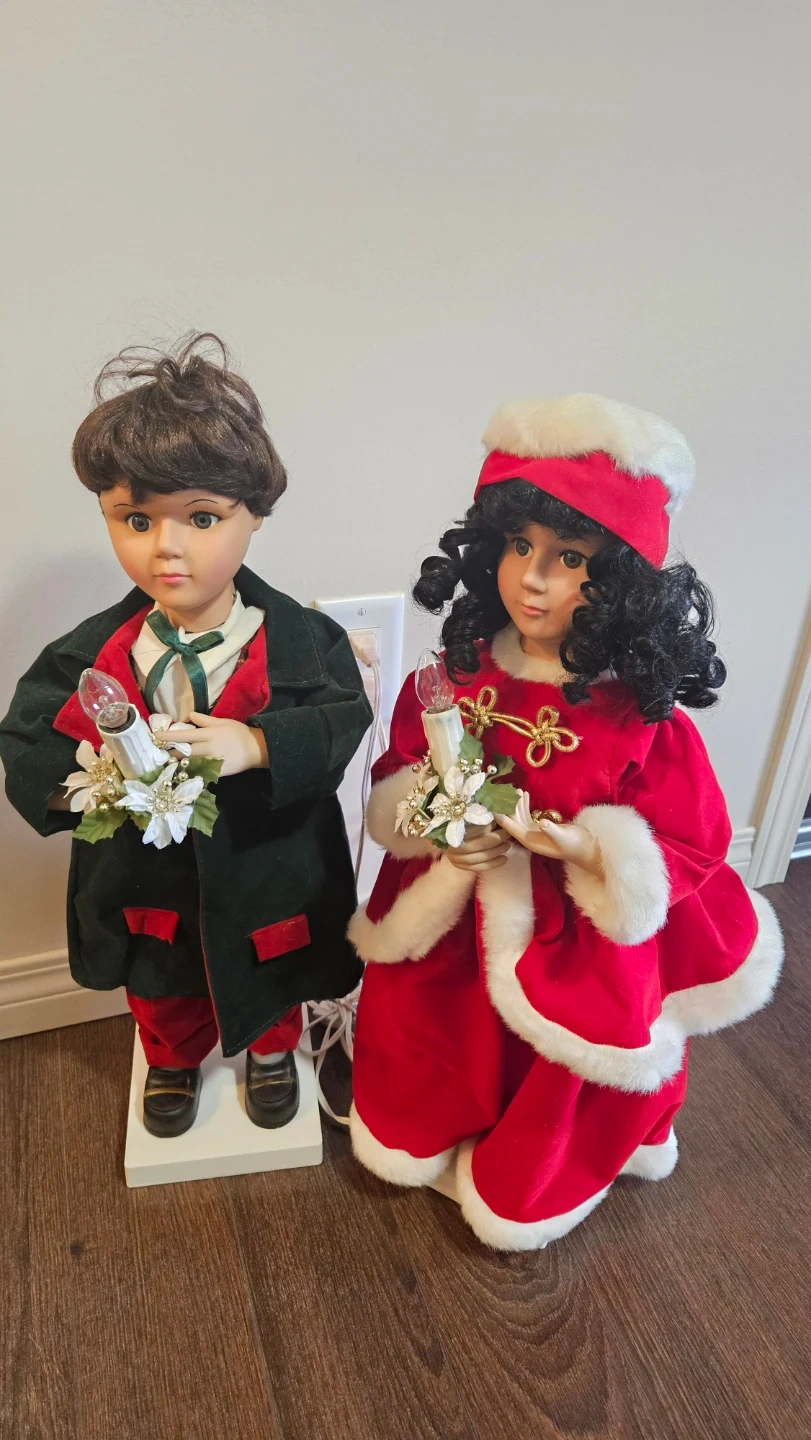 These adorable Christmas caroler dolls are ready to bring some holiday cheer to your home! They're dressed in festive outfits and holding candles. Also the candles go on and they move the hands and heads.