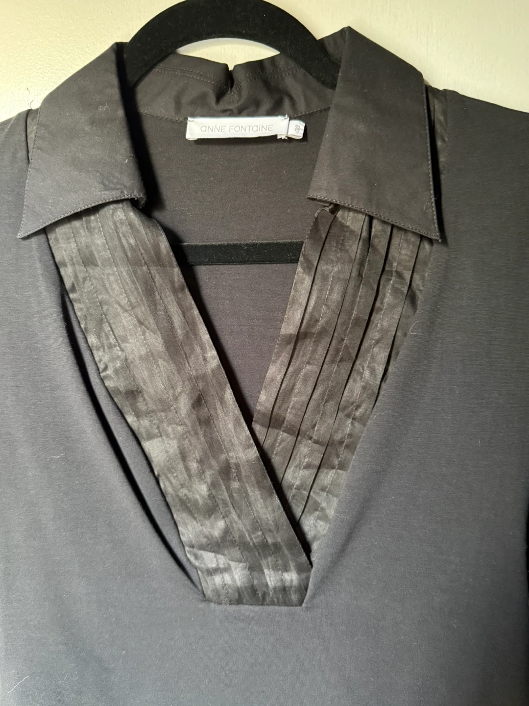 Selling a stylish black blouse from Anne Fontaine. It's a size small and features unique detailing on the collar and sleeves. Perfect for adding a touch of elegance to your wardrobe!