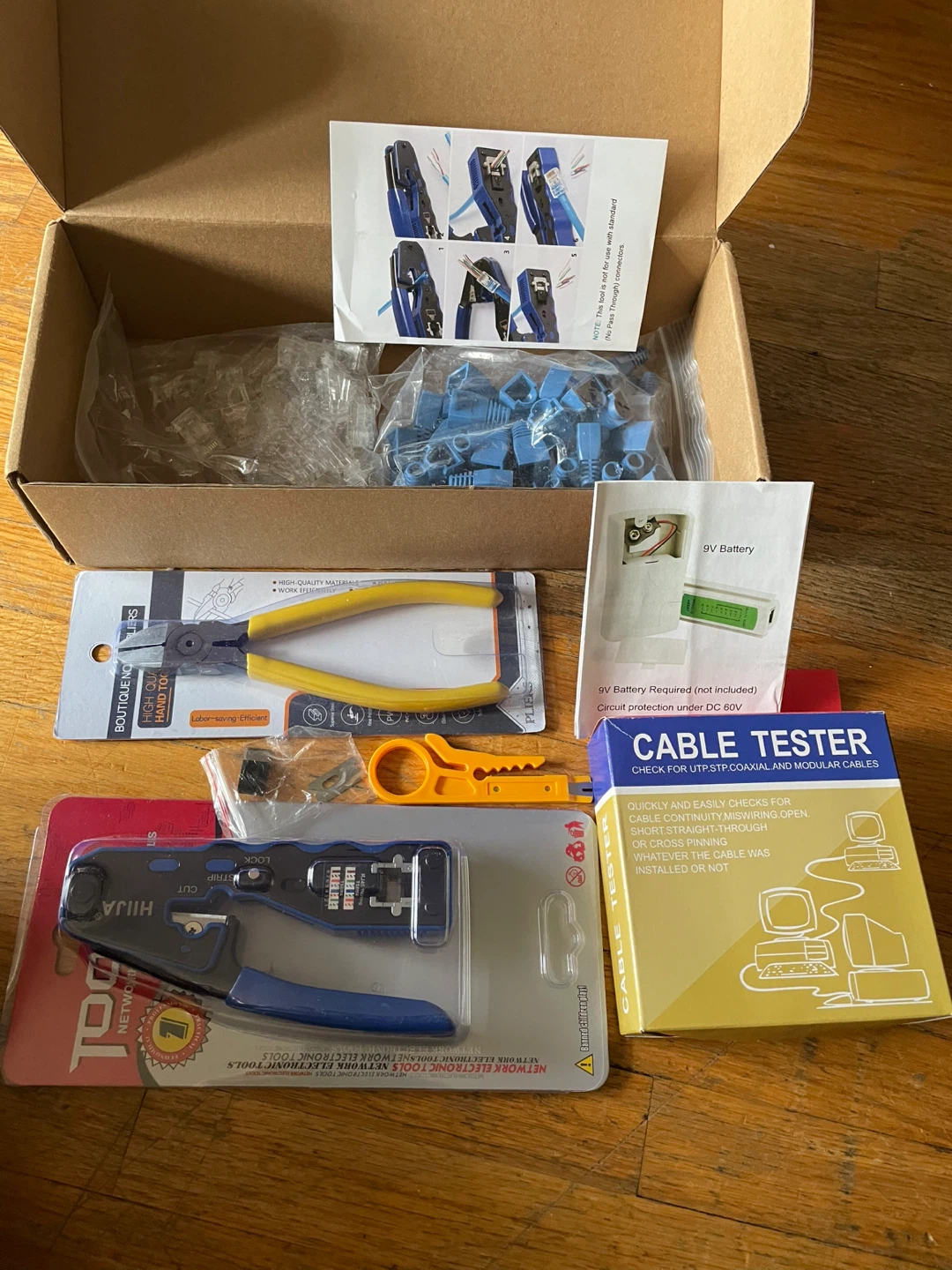 Selling a network cable tool kit including a cable tester. The kit includes a crimper tool, cable stripper, and a box of RJ45 connectors. The cable tester requires a 9V battery (not included). Great for setting up your home or office network!