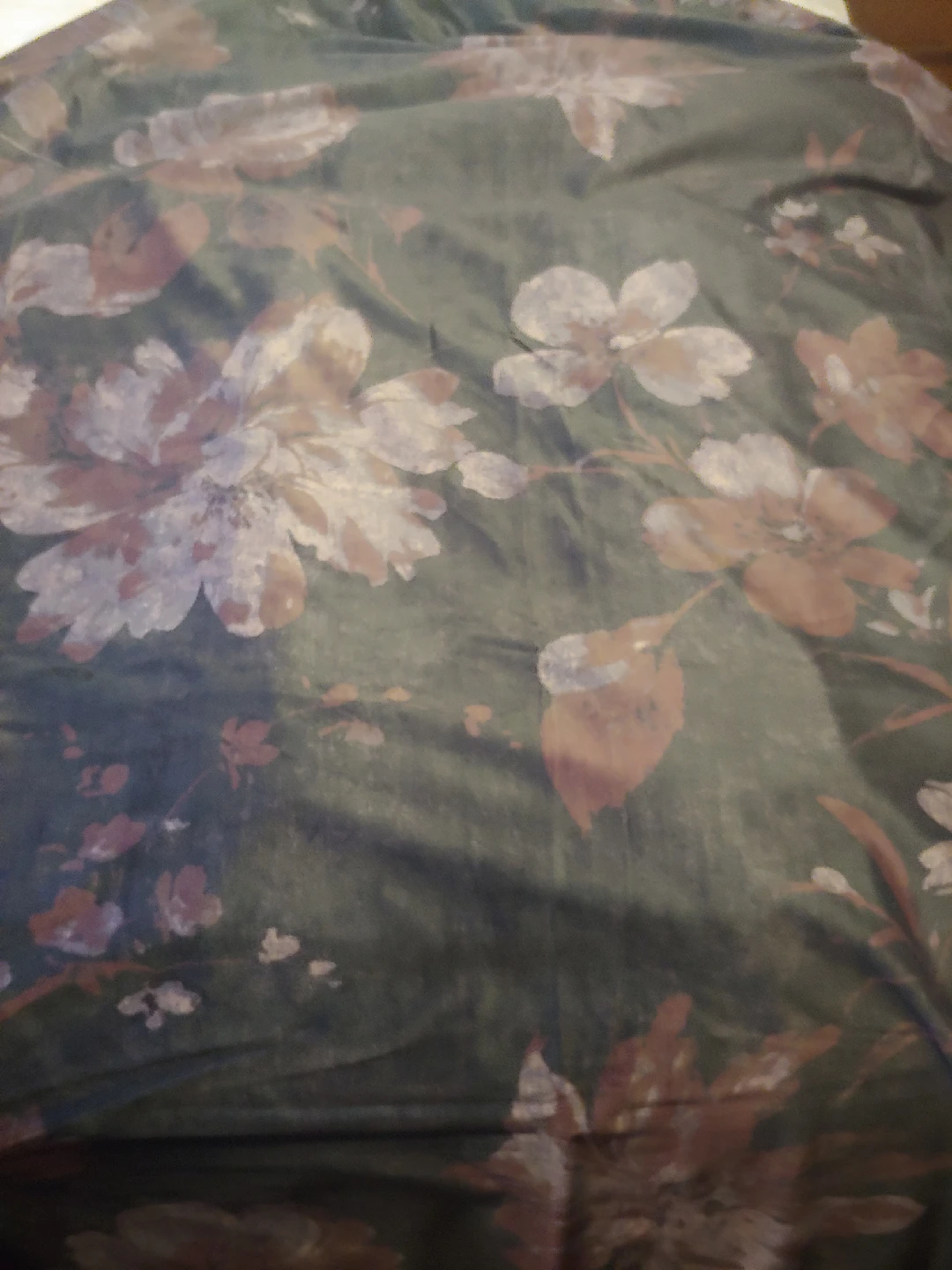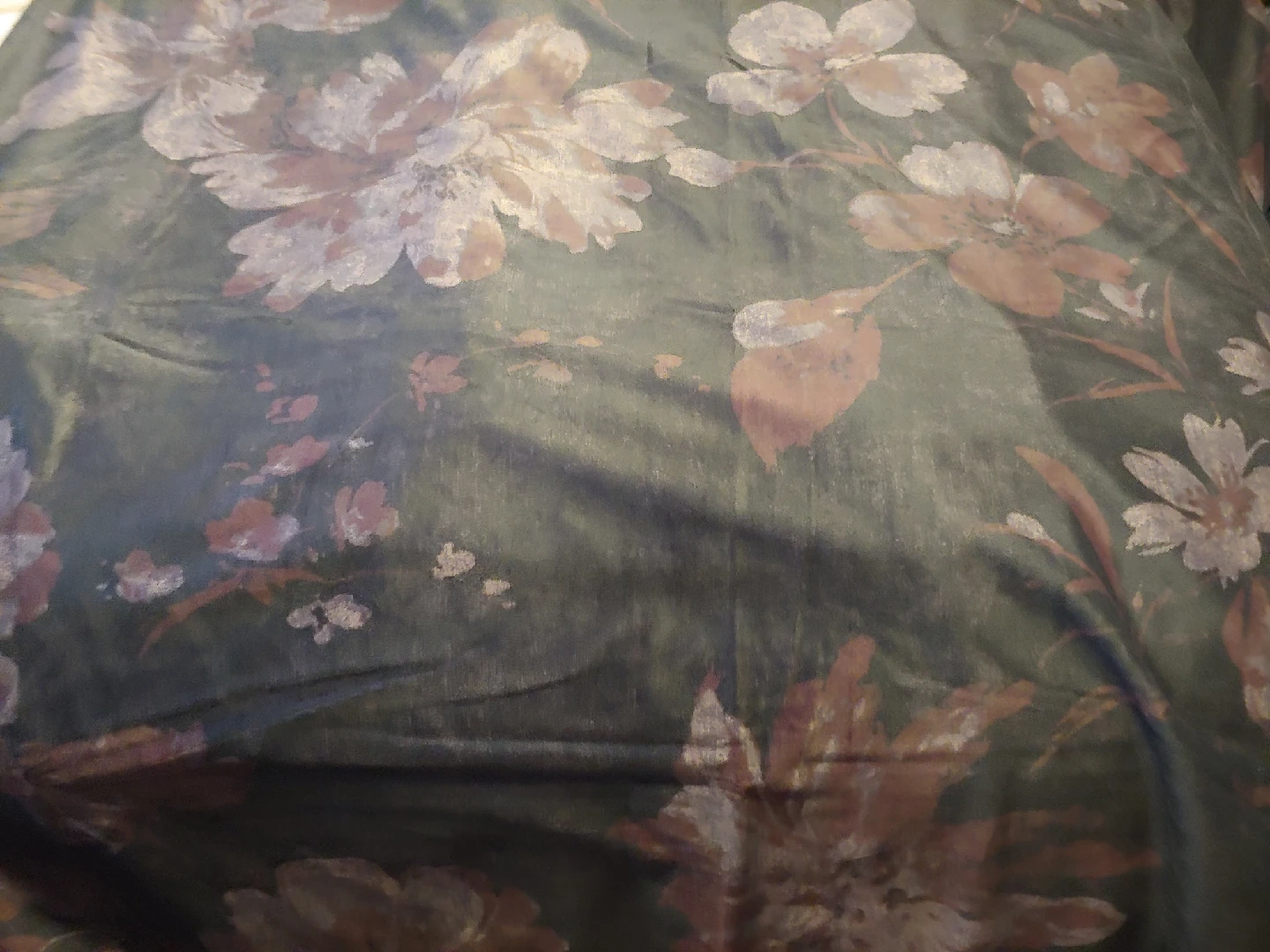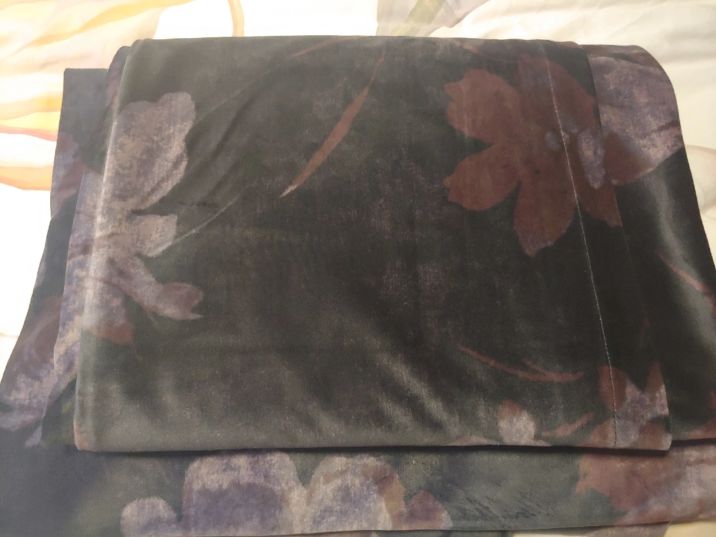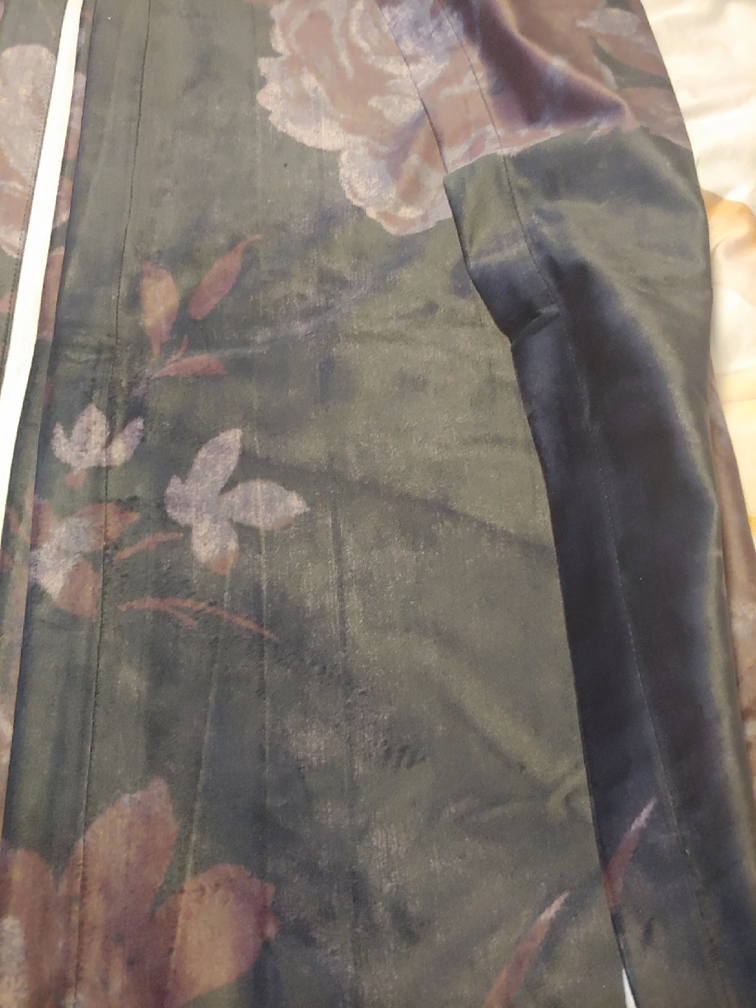 a pair of velvet curtains, rod pocket style. Approximately 51 by 90 inches for each panel. a 'soft' black with purple and pink floral pattern. like new condition.