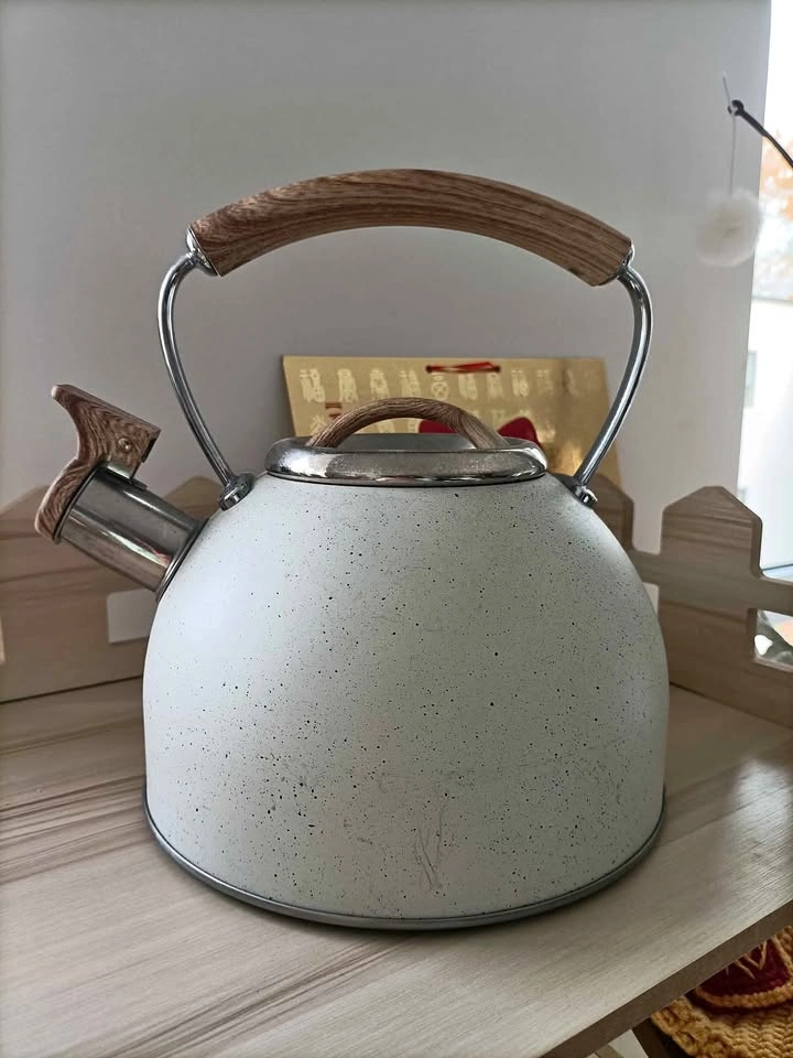 Just Teazen Stovetop Whistling Tea Kettle made of stainless steel with a speckled finish and has a wood grain-look handle and lid.