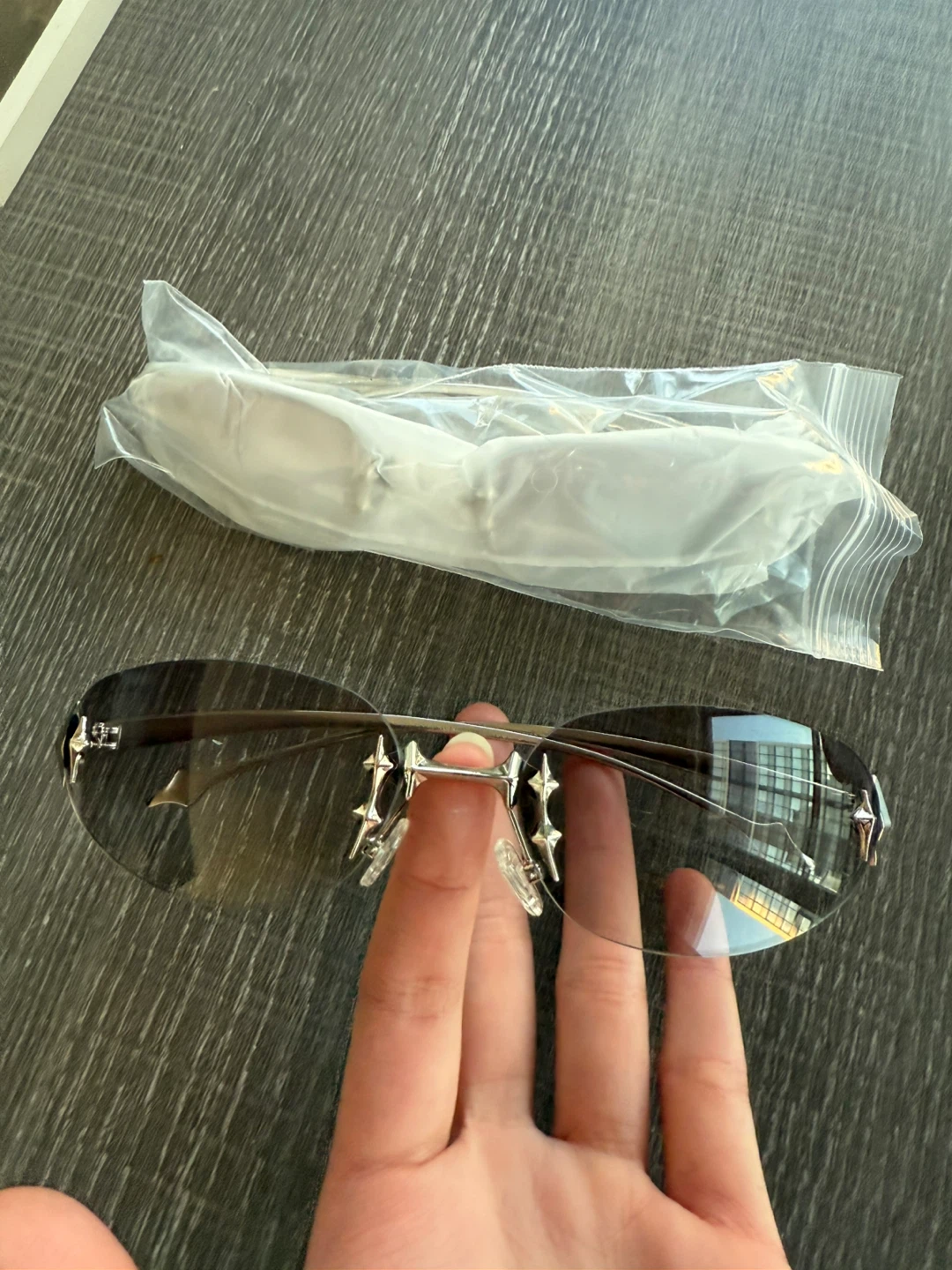 Selling these stylish rimless sunglasses with star details! They're in great condition and come with a protective pouch to keep them safe. Perfect for adding a bit of sparkle to your look!