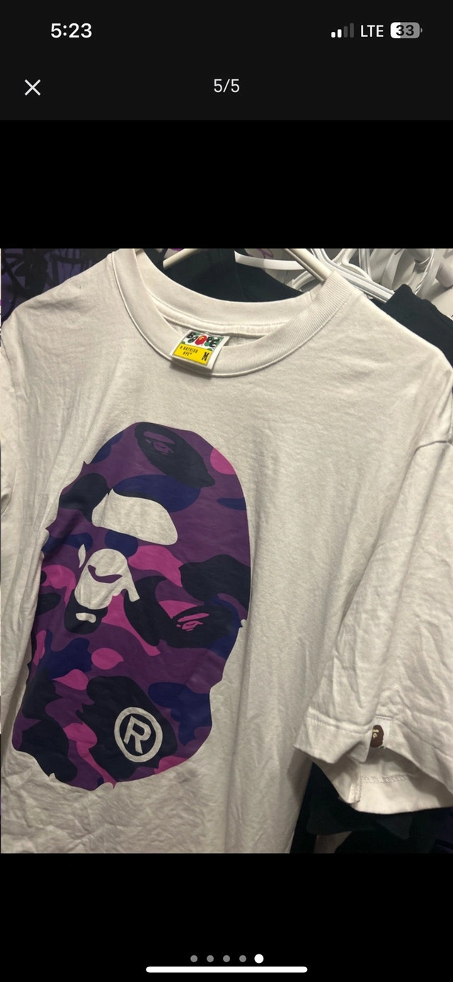 21Authentic BAPE tee featuring the classic purple camo Ape Head logo. Size Medium – fits true to size. Black colourway with purple camo graphic and BAPE sleeve tag. Good condition, no rips or stains. 100% authentic, from official A Bathing Ape drop.