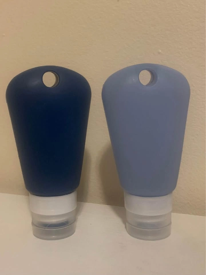 1000+Set of two silicone travel bottles. One is a darker blue, and the other is a lighter blue. They're great for carrying shampoo, conditioner, or lotion when you're on the go!