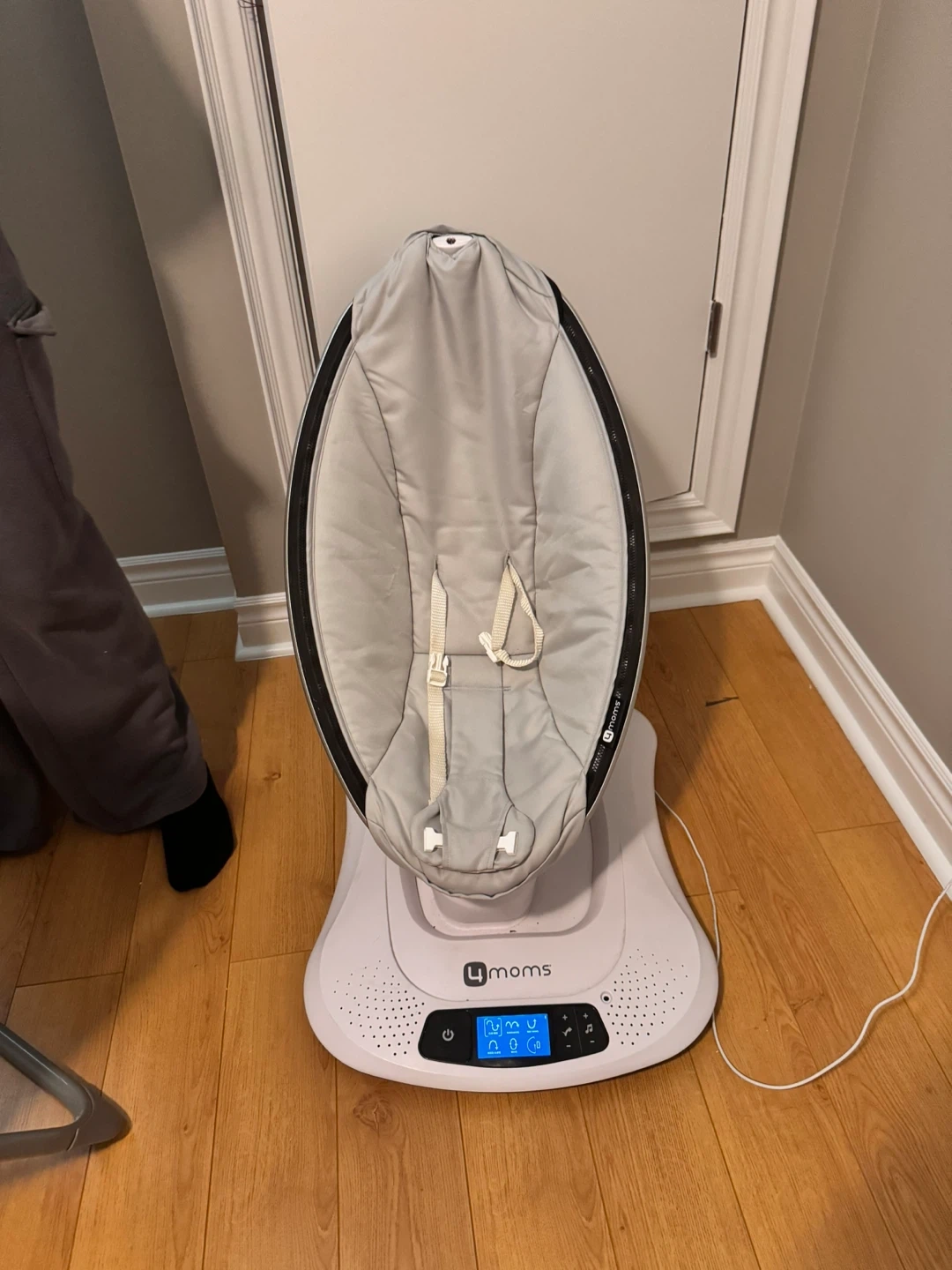 Selling a 4moms MamaRoo baby swing! It's in great condition and ready for a new home. This swing offers different motions and speeds to soothe your little one. It has built-in sounds and the option to connect your MP3 device. Perfect for keeping your baby comfortable and entertained!