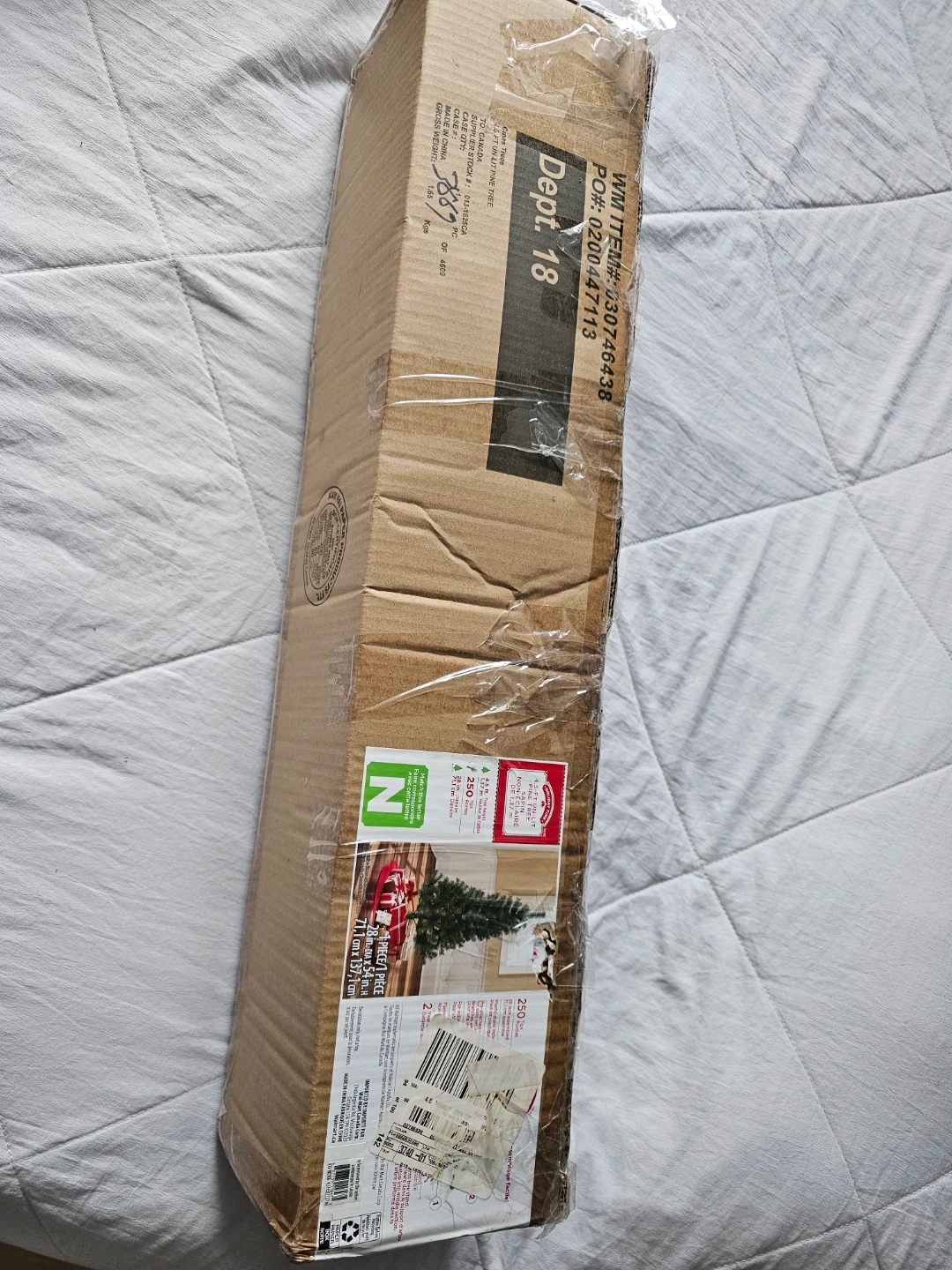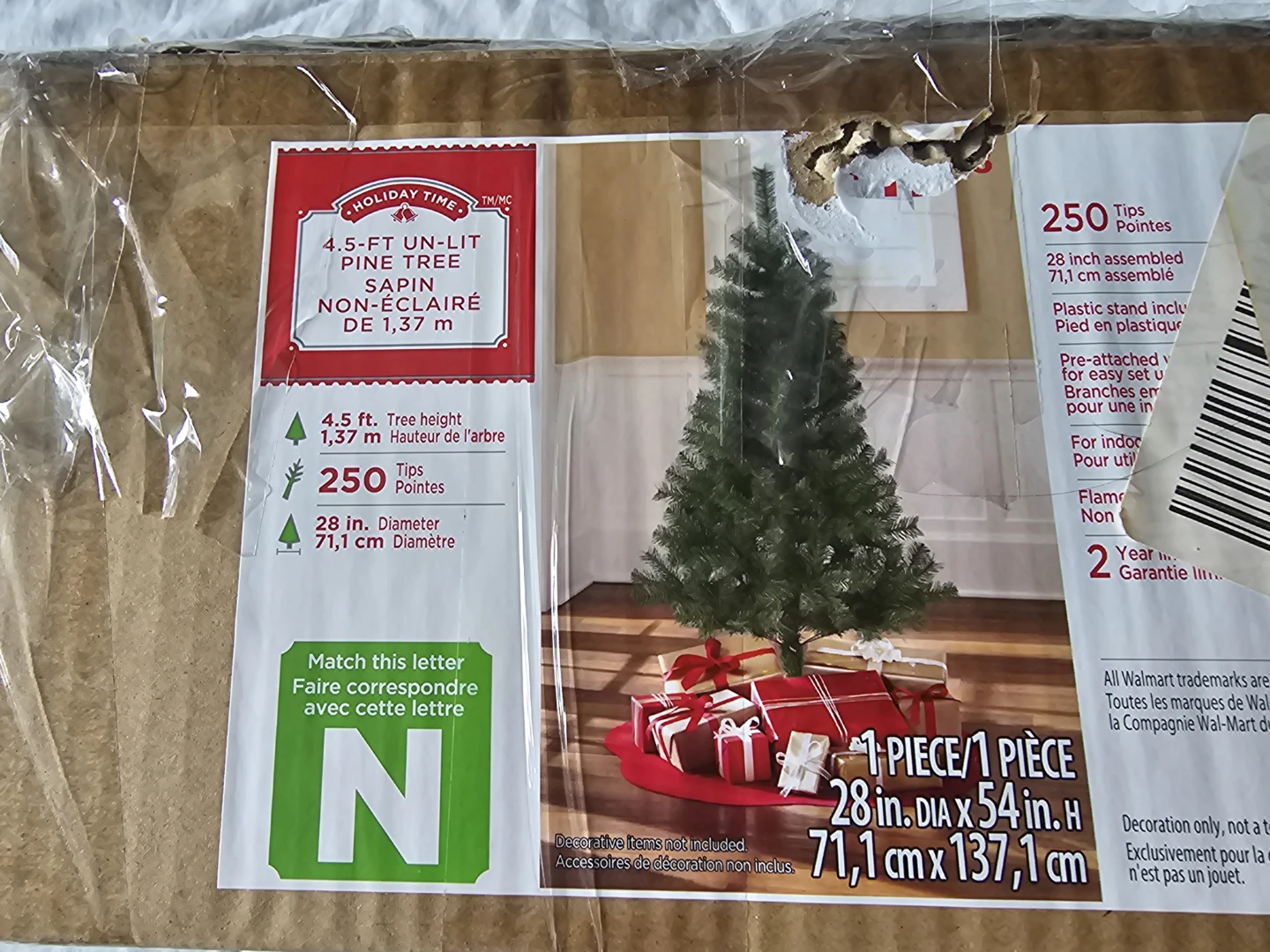 It's still in the original packaging. The tree is 4.5 ft (1.37 m) tall and has a 28-inch (71.1 cm) diameter. It comes with 250 tips and a plastic stand included. The box measures 28 in. x 54 in. H (71.1 cm x 137.1 cm)