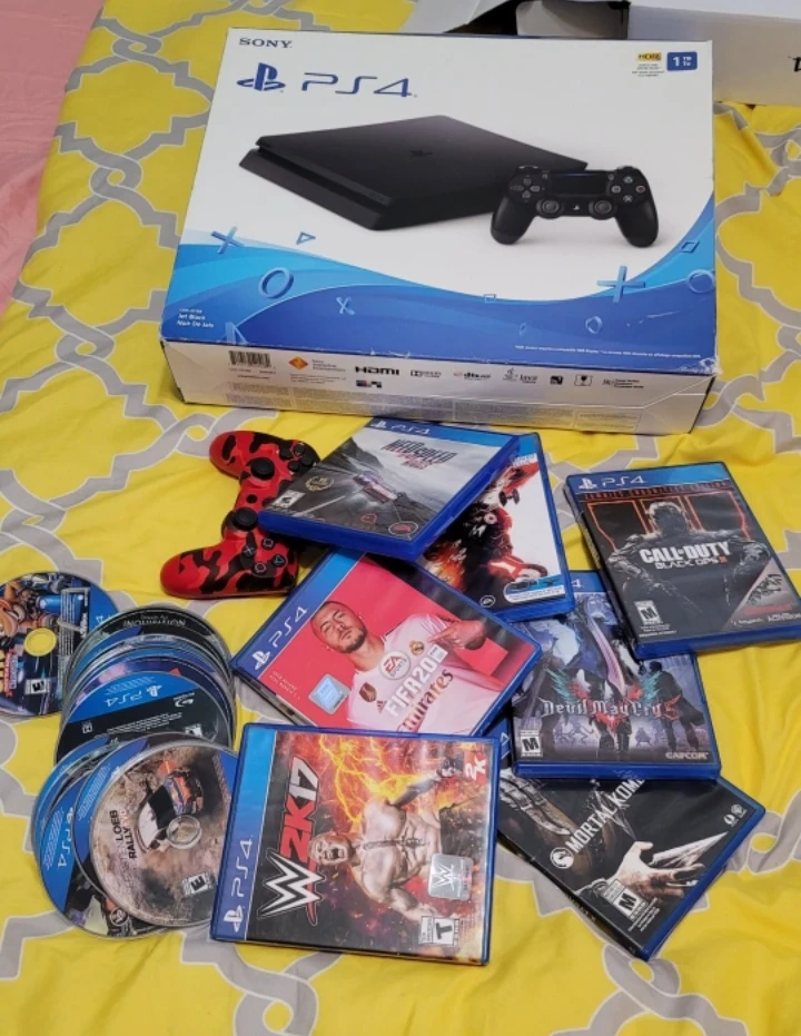 Selling a used PlayStation 4 Slim with 1TB storage. It comes with a variety of games and 2 controllers, as pictured. Great for anyone looking to get into gaming or expand their collection. Please check out my other listing. Pick-up Downtown Windsor.