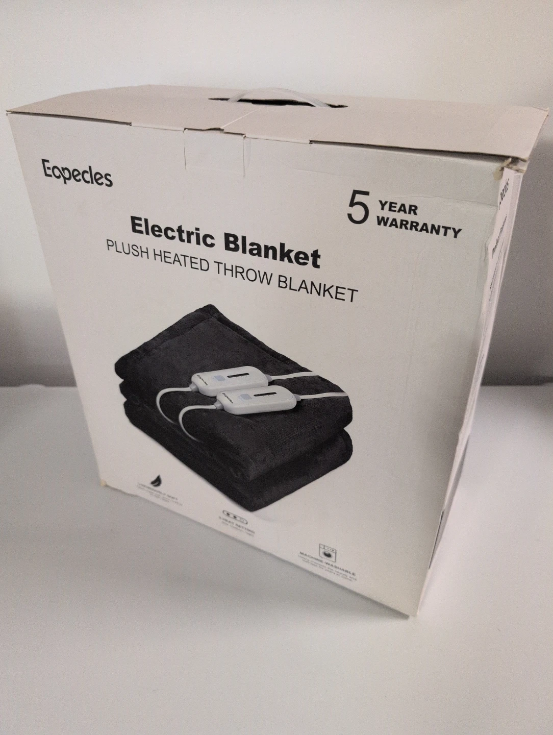90" x 100" heated blanket. Perfect for the upcoming winter. The box is a bit squished but the blanket is new in its original packaging.