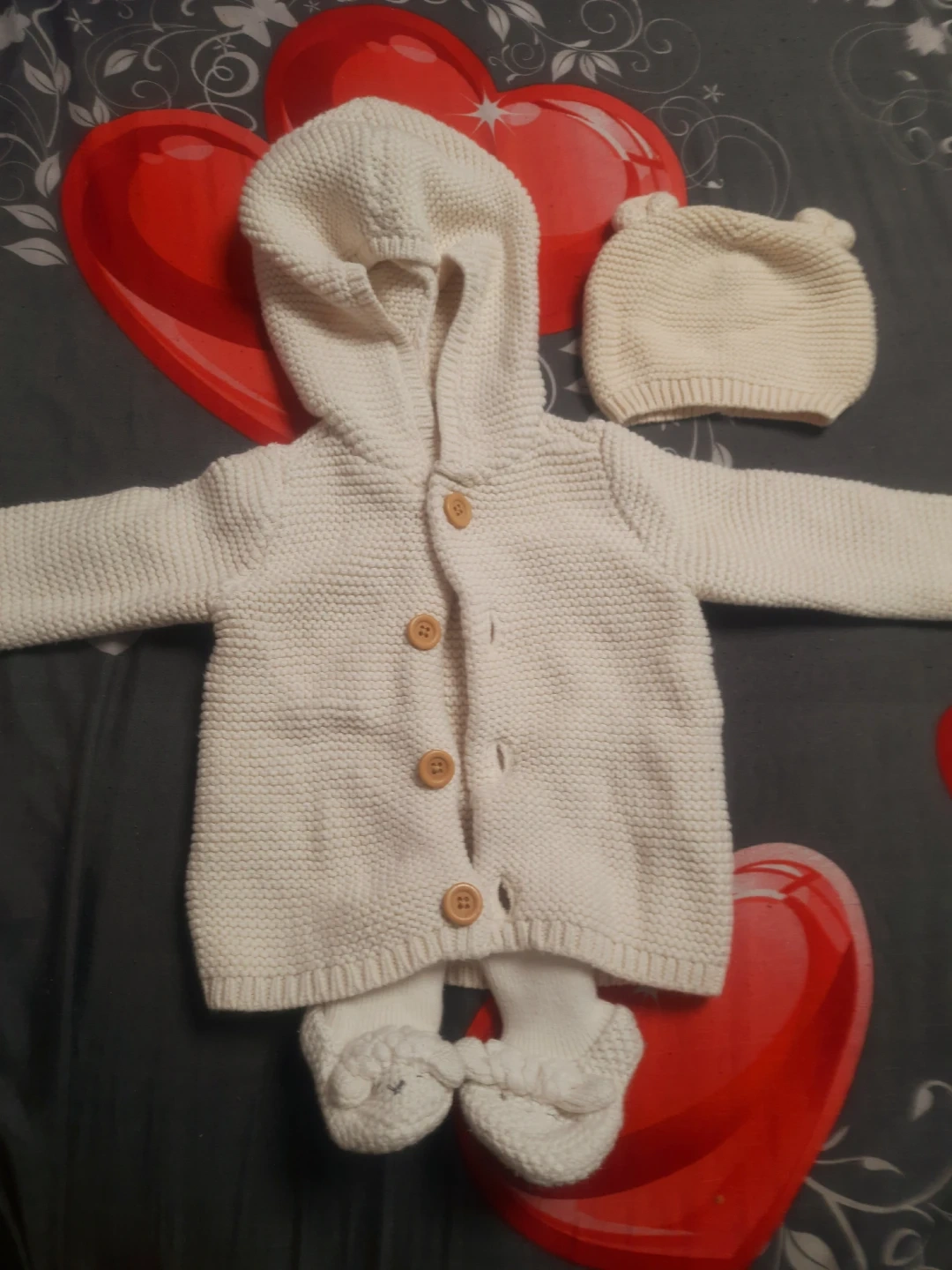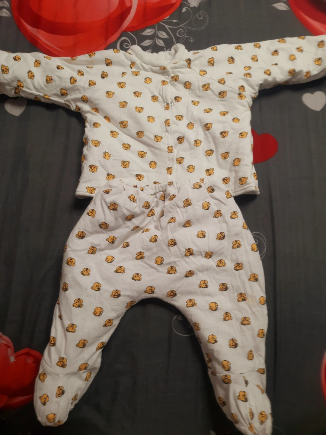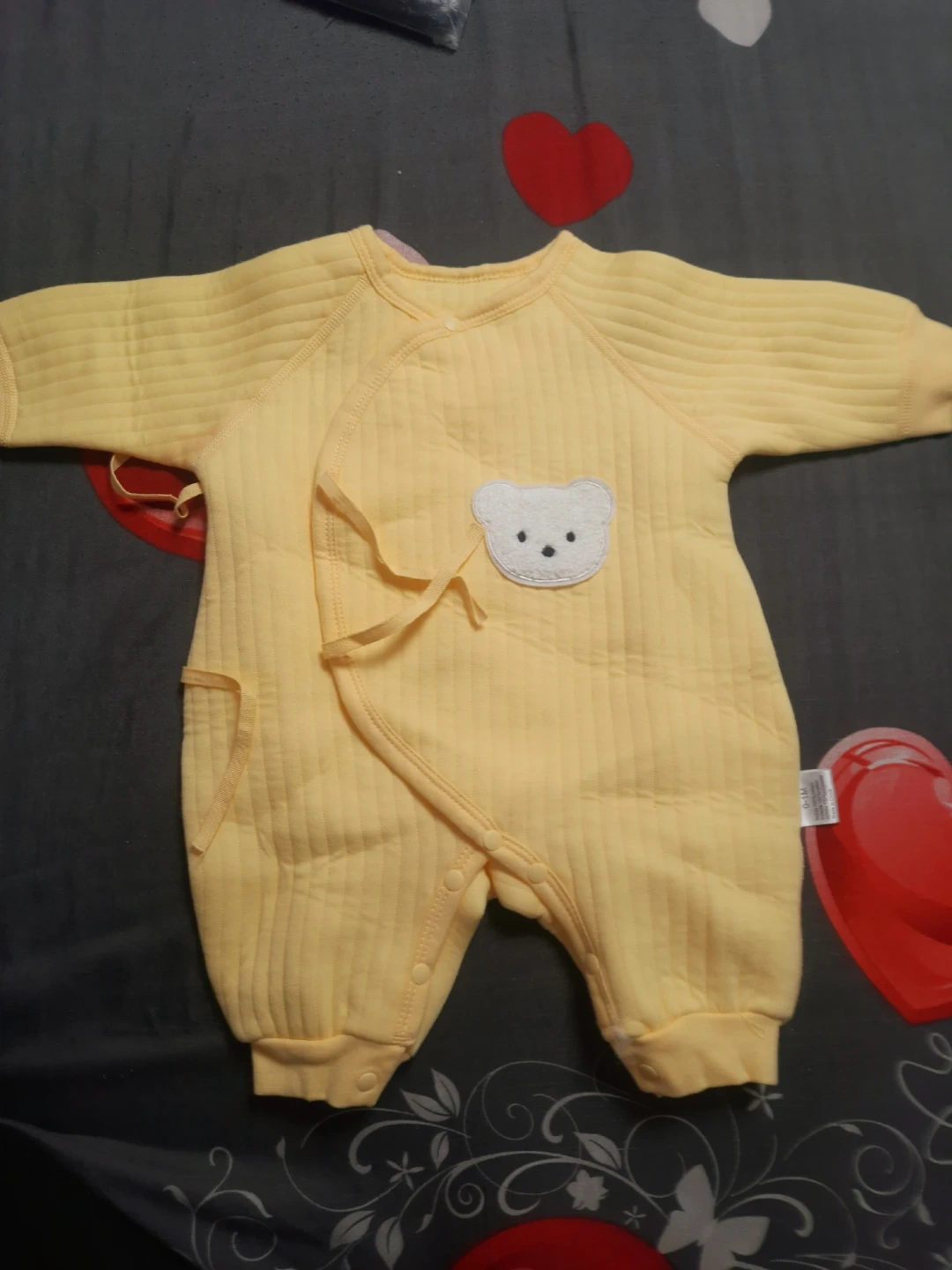 Selling a cute bundle of baby clothing! Includes a yellow onesie, a bear-themed pajama set, and a cozy brown bear hooded blanket. All in good condition and ready for a new little one. Only one dress one time used other all of new.