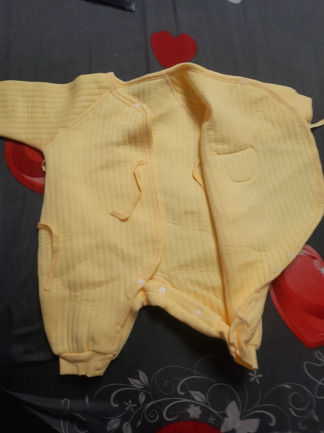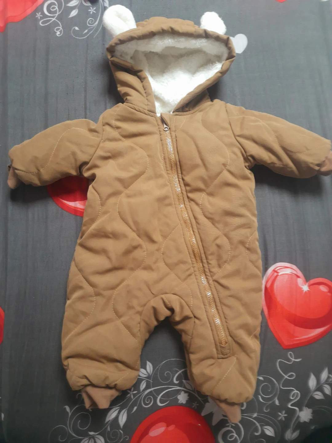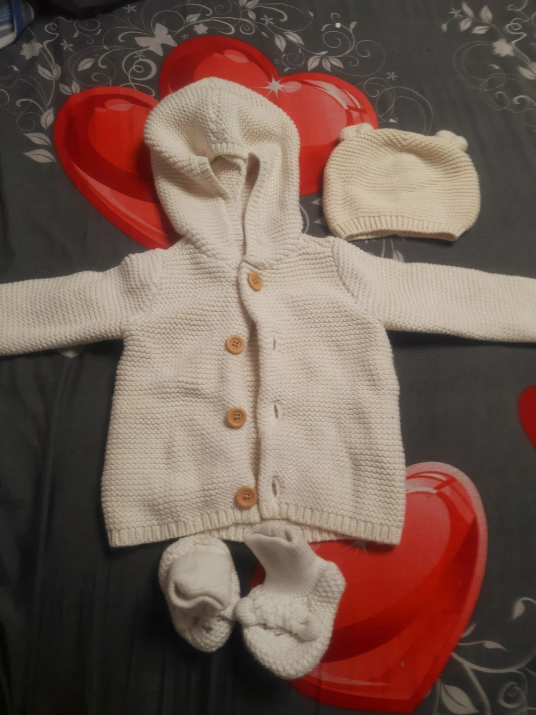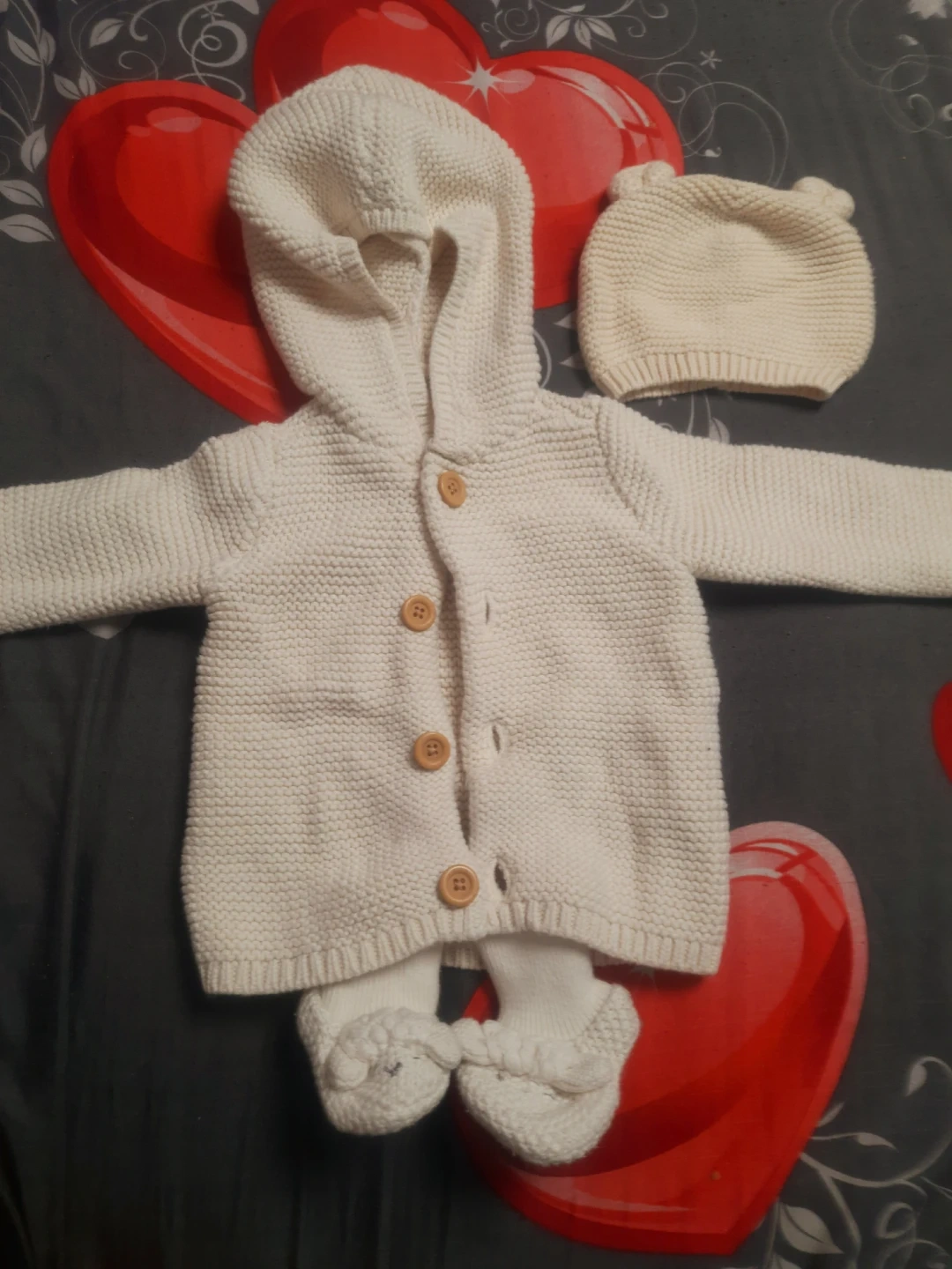 Selling a cute bundle of baby clothing! Includes a yellow onesie, a bear-themed pajama set, and a cozy brown bear hooded blanket. All in good condition and ready for a new little one. Only one dress one time used other all of new.