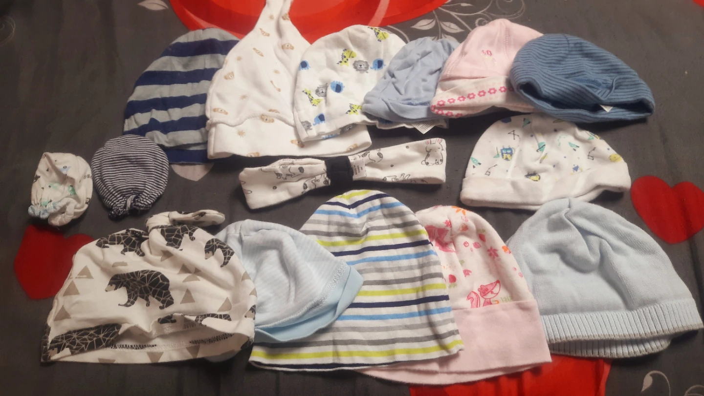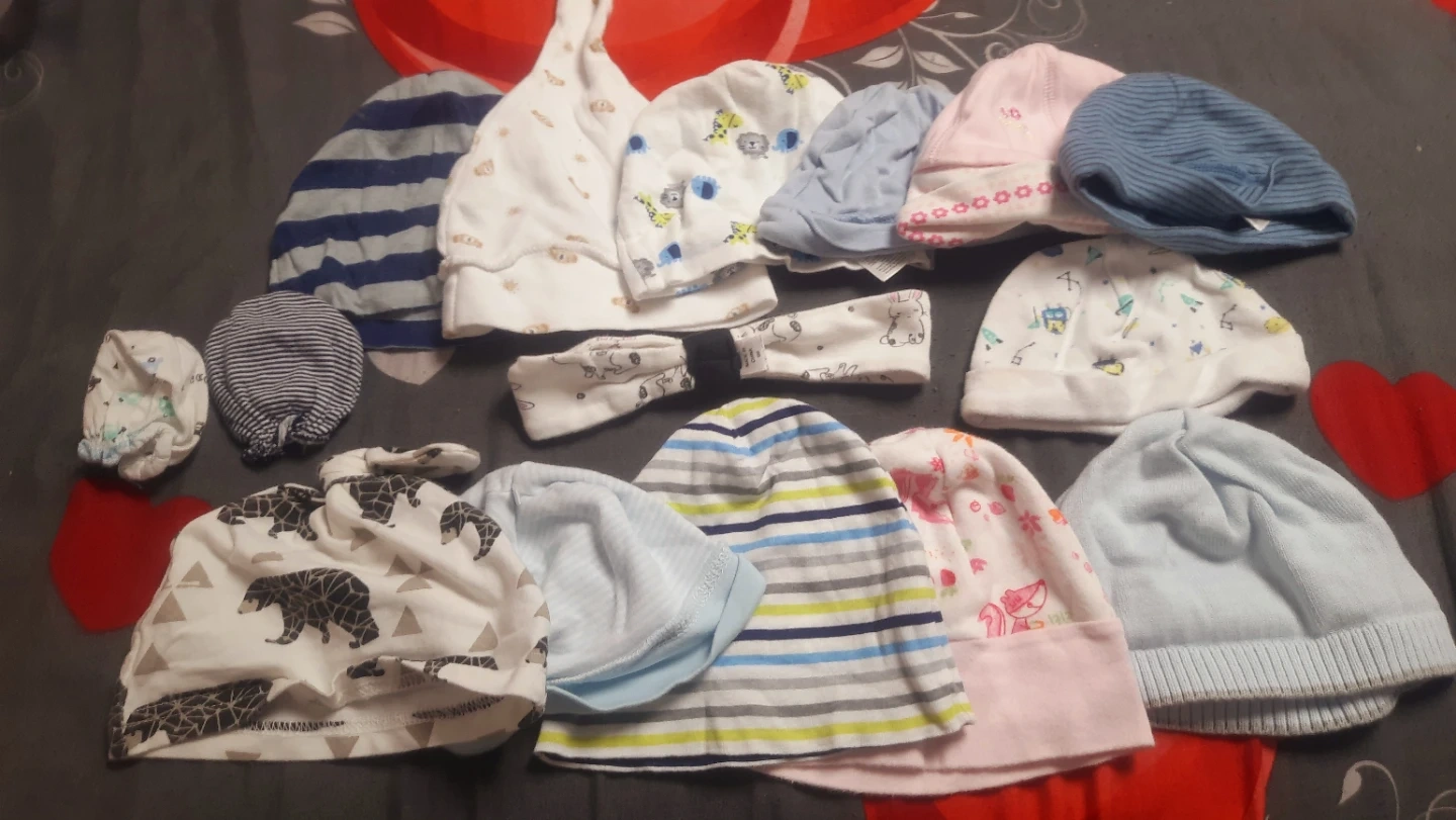 Selling a bundle of adorable baby hats and mittens! They come in various colours and patterns. Perfect to keep your little one warm and cozy!
