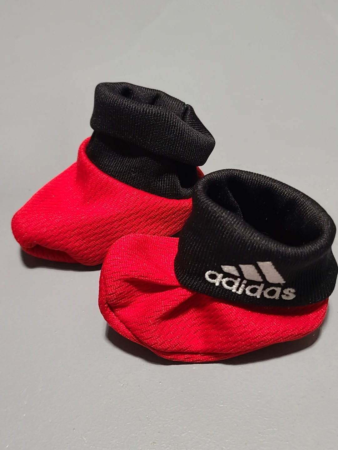 Super cute Adidas baby booties in red and black! Perfect for keeping those little feet warm and stylish. 0-6 months