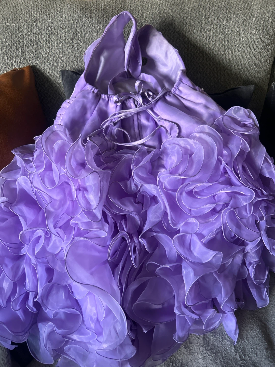 Selling a beautiful purple party dress with a ruffled design. It's in great condition and would be perfect for a special occasion! The dress features layers of ruffles and delicate embellishments.