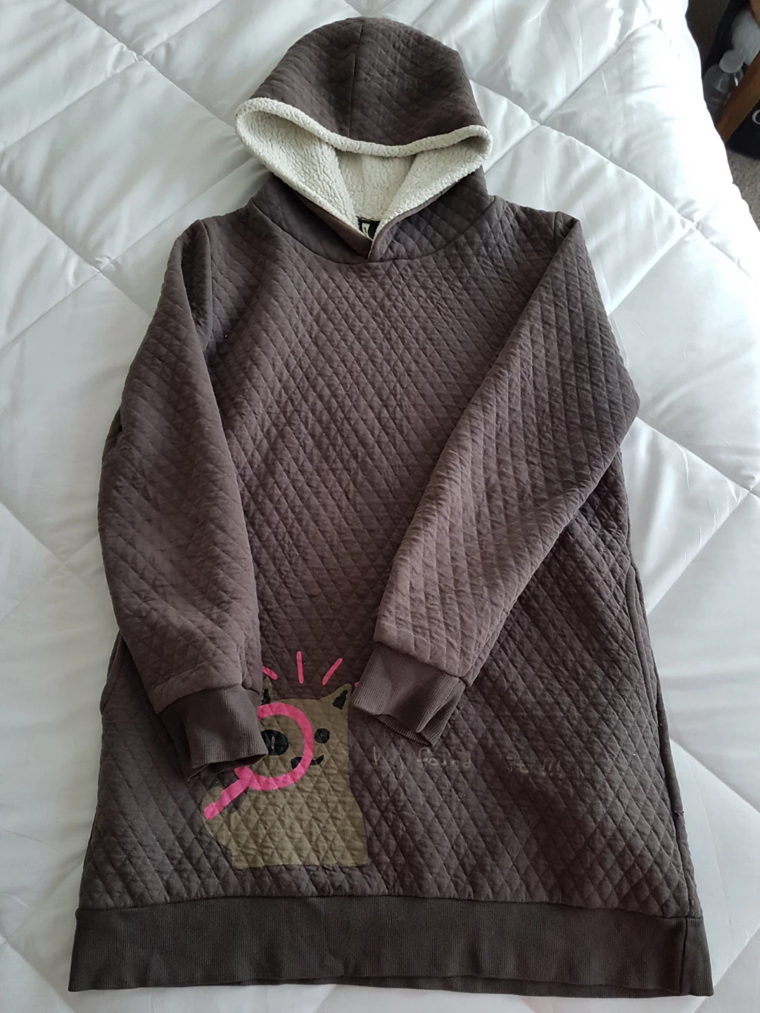 Cozy up in this TITISEA CO. quilted hoodie dress! It's a size L and features a cute design on the front. Perfect for chilly days or lounging around the house; it even has pockets! Please also check out my other listings on this account. This is a no pet/ smoke home. Pick Up Cochrane, Alberta