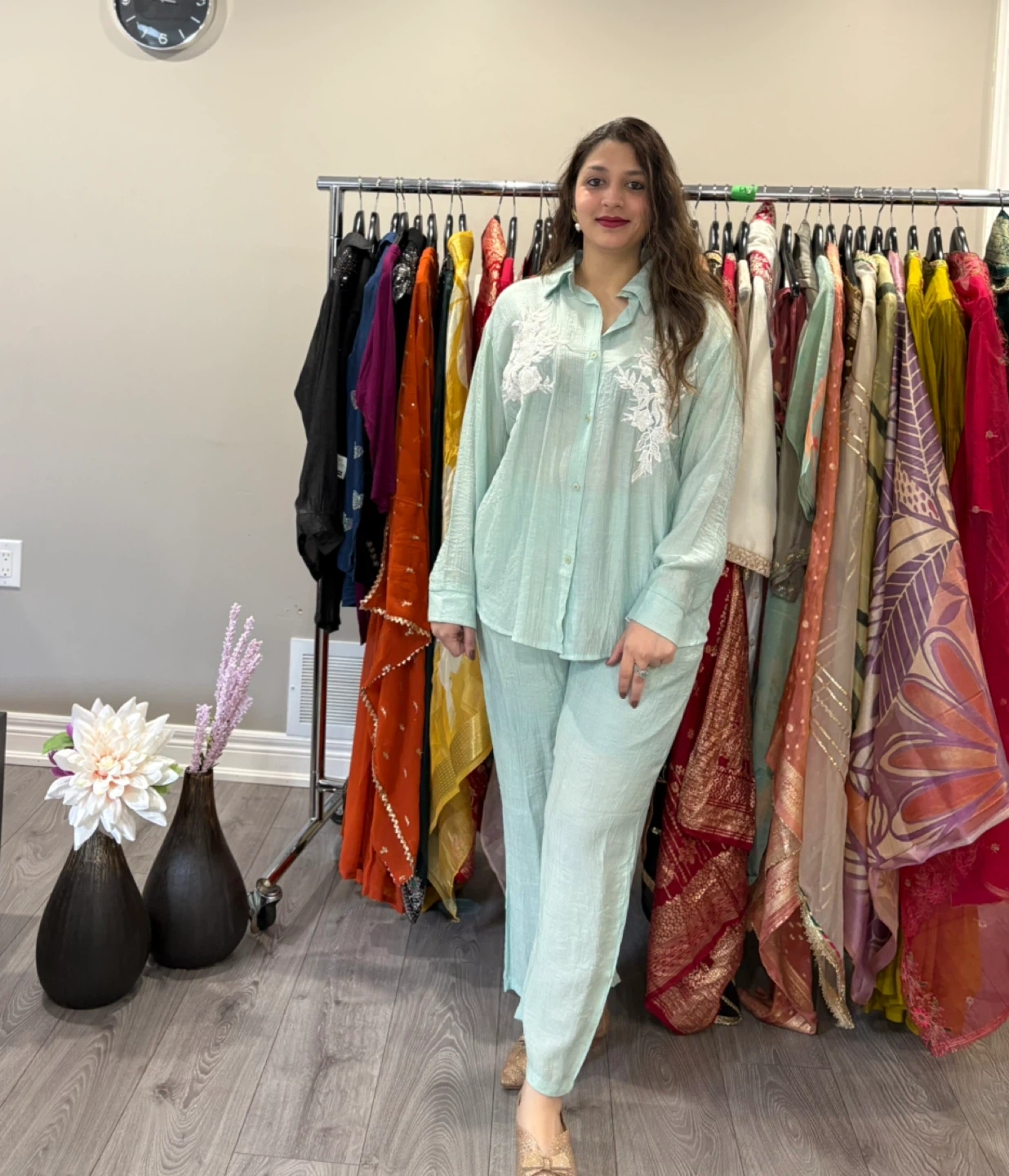 A comfy light green lounge set with delicate white floral embroidery! Perfect for relaxing at home or a casual day out. The fabric feels soft and breathable…
