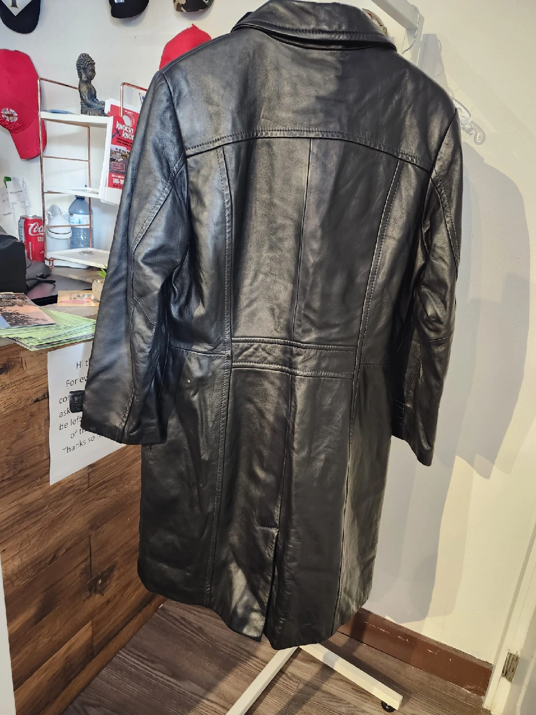 Selling a sleek black leather coat, perfect for adding a touch of style to any outfit. It's in great condition and ready for a new home!