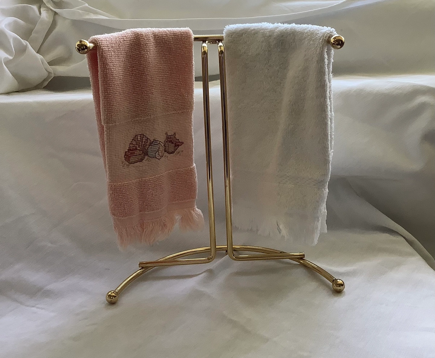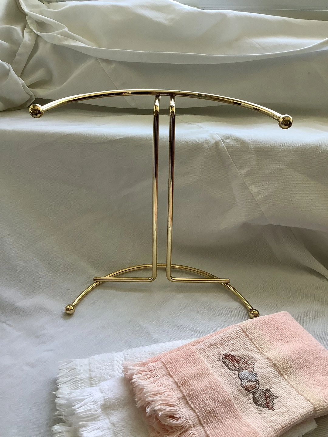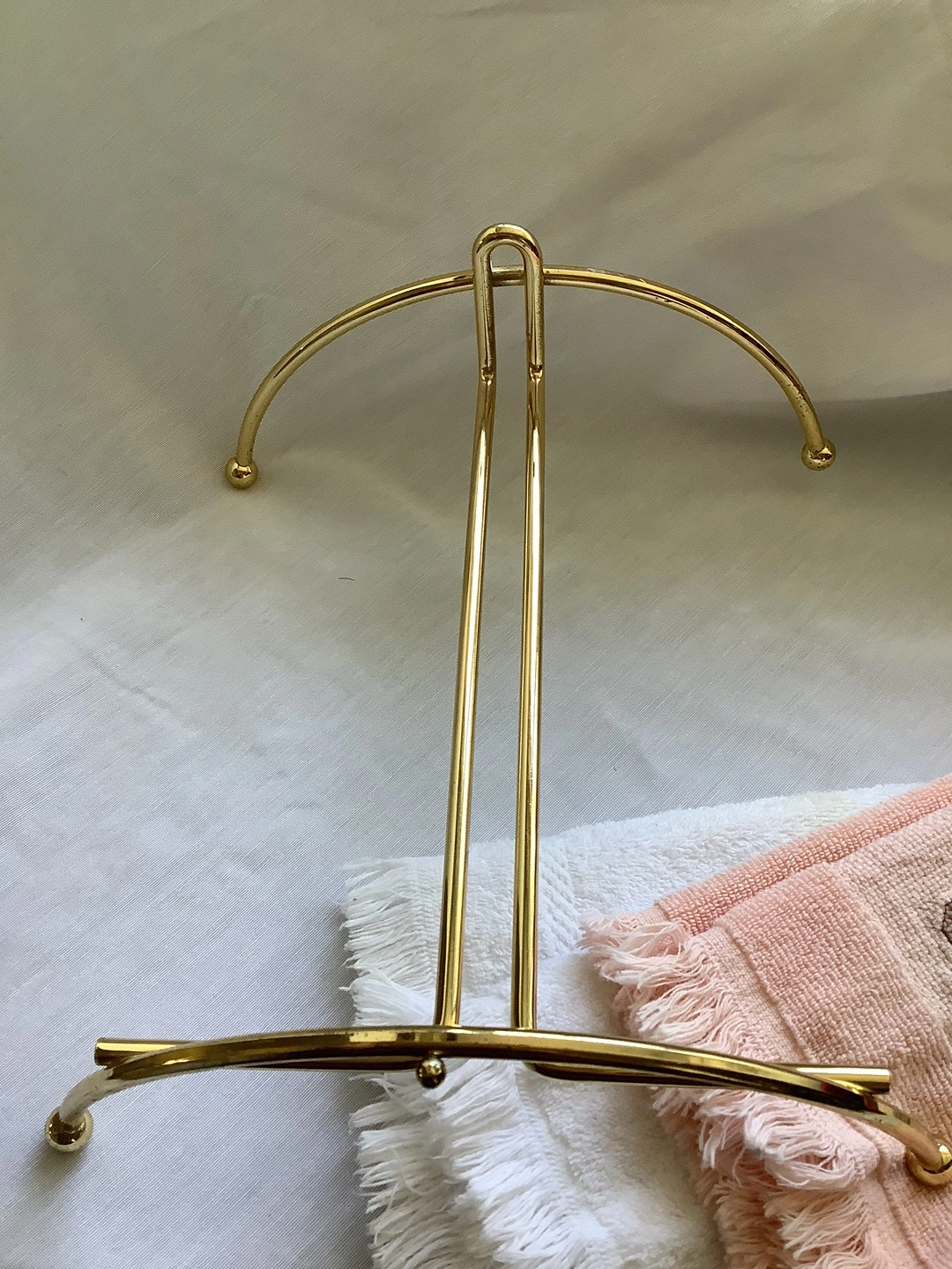 Selling a gold-tone towel rack in good condition. It's perfect for displaying hand towels in your bathroom or kitchen. It's a stylish and functional way to organize your towels and add a touch of elegance to your space