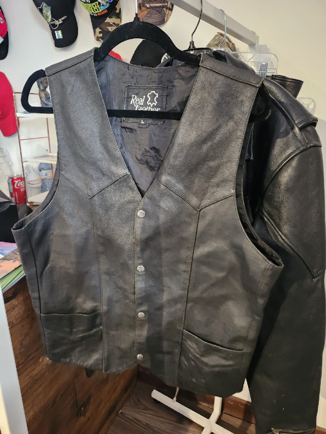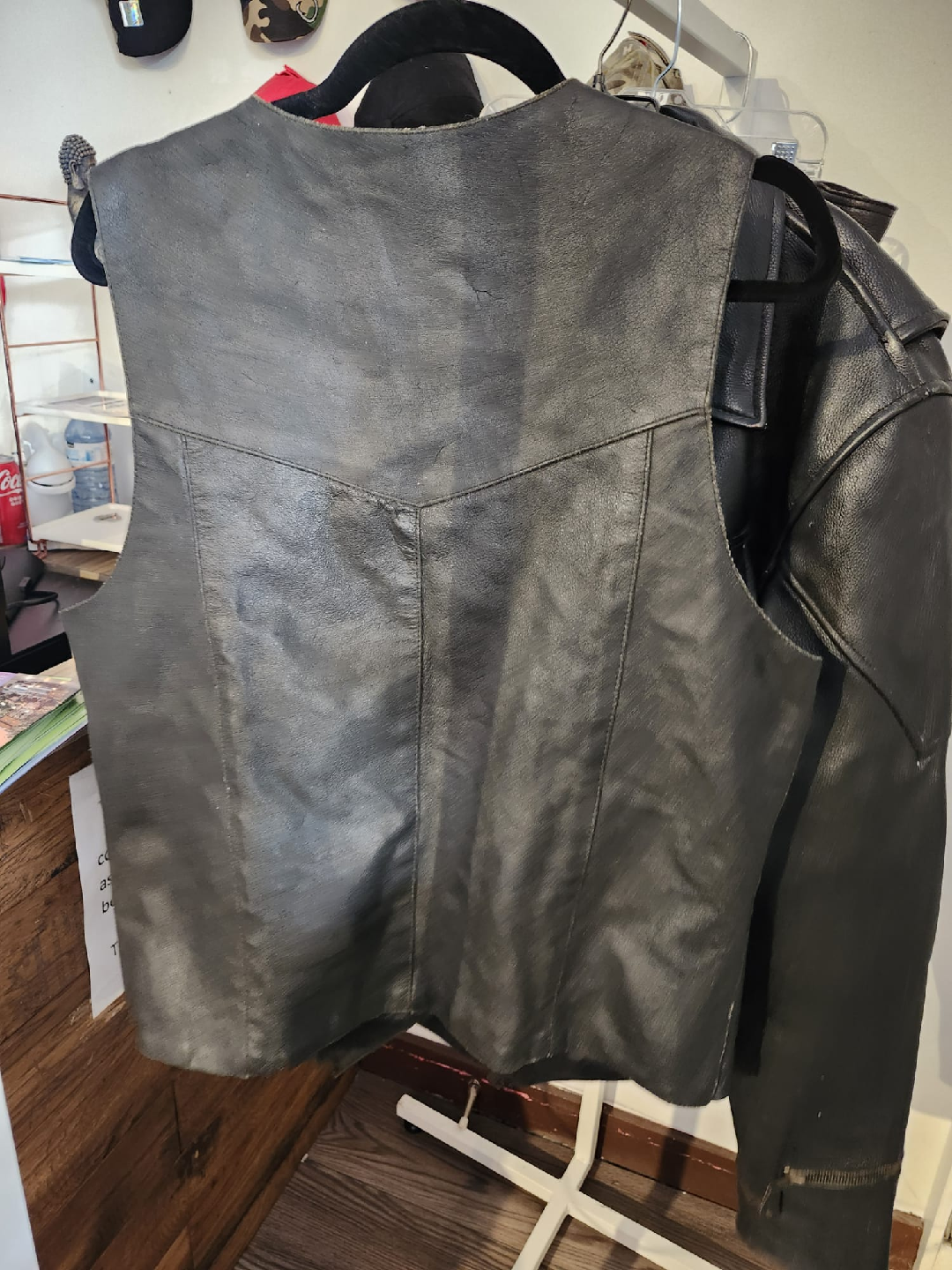 Here's a classic black leather vest! It's in great shape and made of real leather. The size is L.