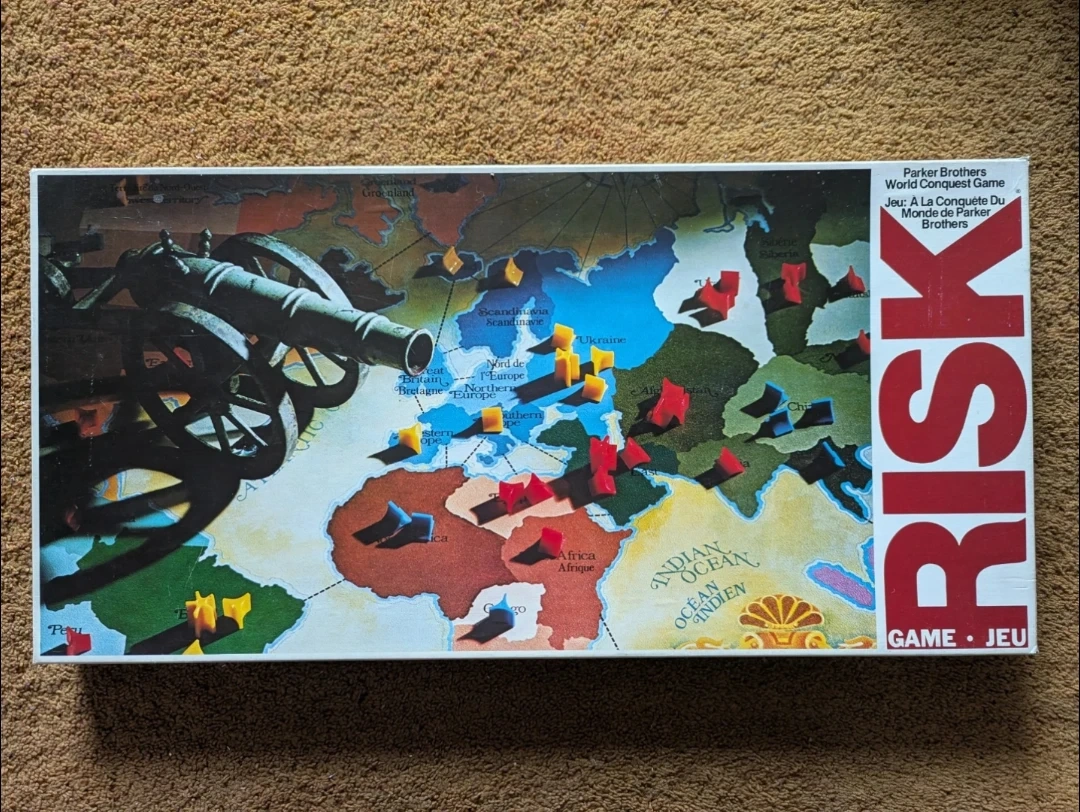 Selling a classic Risk board game by Parker Brothers! Hours of strategic fun await. The box shows some wear, but all pieces are included and in good condition. Get ready to conquer the world!