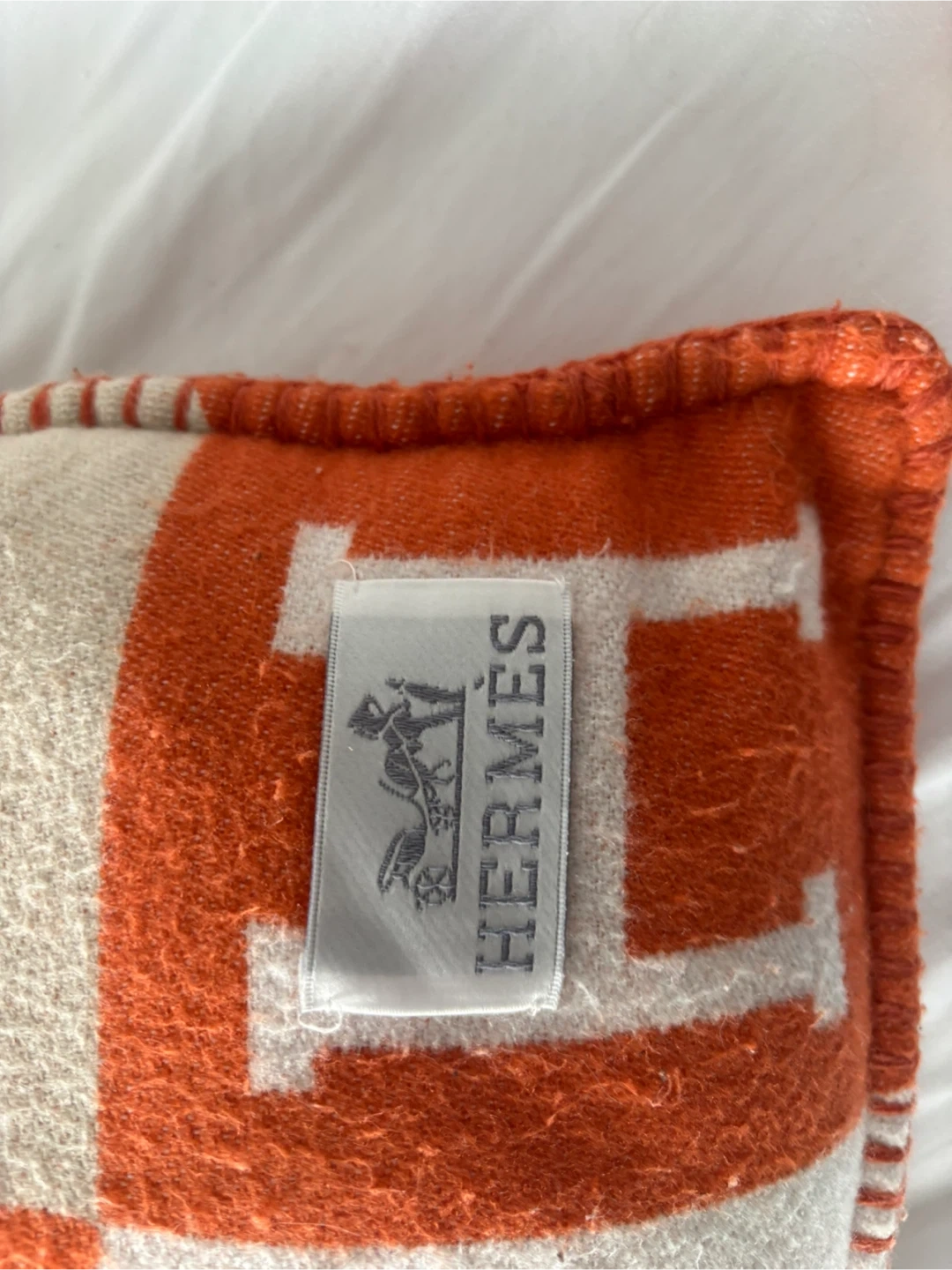 Selling a set of two Hermès Avalon III throw pillows in orange and beige. These stylish pillows add a touch of luxury to any room! They feature the iconic Hermès 'H' design. Perfect for your couch or bed!