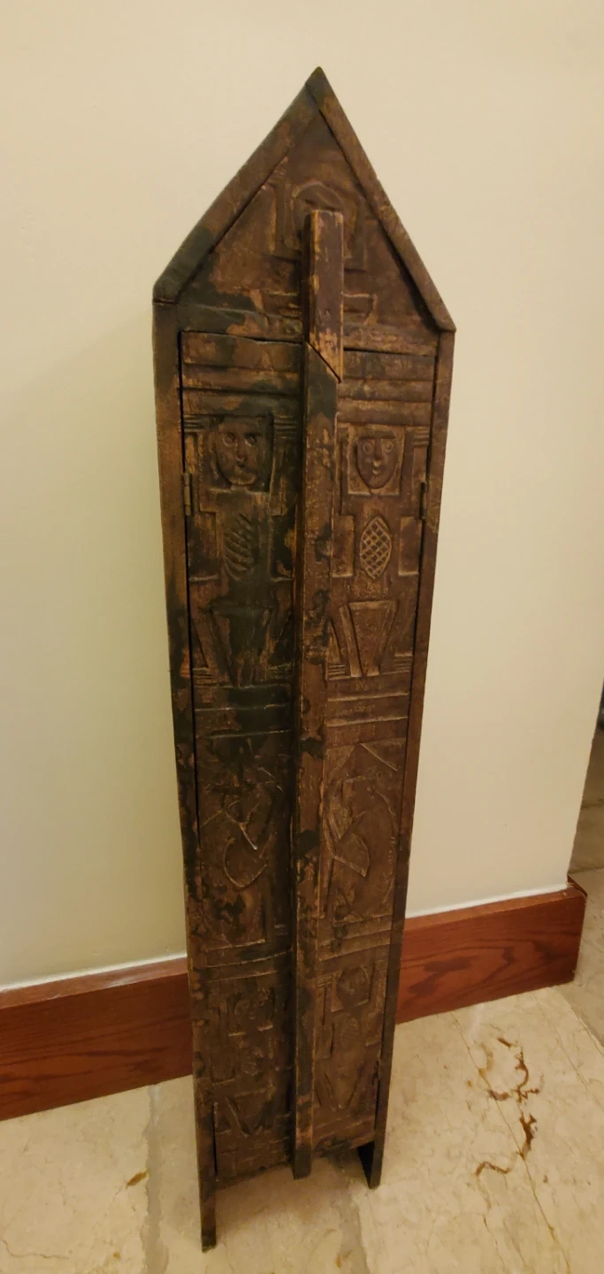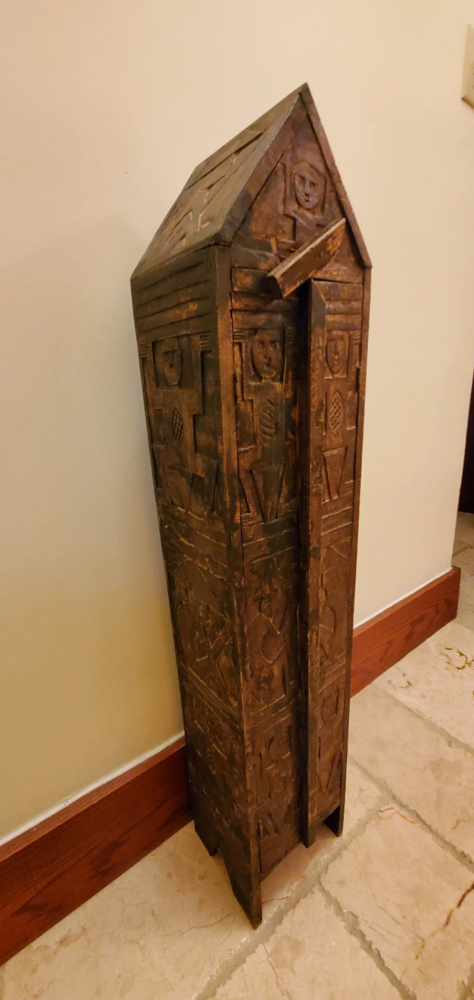 This is a unique, vintage carved wood cabinet. It features detailed carvings on all sides and has an interesting shape. I ln very good condition. Perfect for adding some storage with a touch of rustic charm to your home!