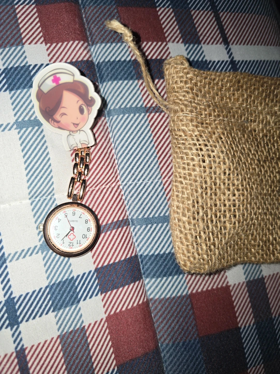 60Selling a nurse fob watch. It features a quartz movement and comes with a cute nurse cartoon design. The watch is in great condition and includes a burlap bag for storage 🥕