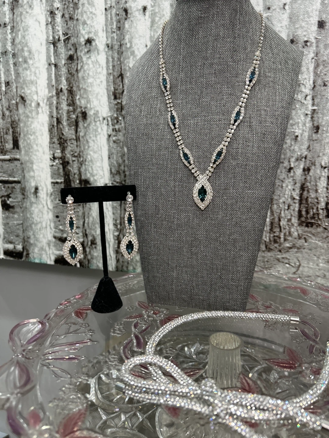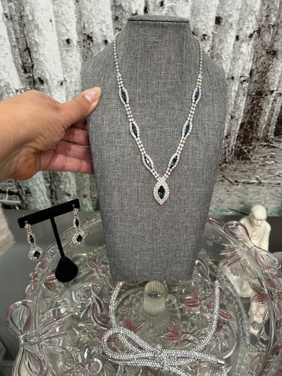 23Selling a beautiful necklace and earring set! The set features silver detailing with blue accents, perfect for adding a touch of elegance to any outfit. The earrings are drop style and complement the necklace nicely. Great for special occasions or dressing up your everyday look!