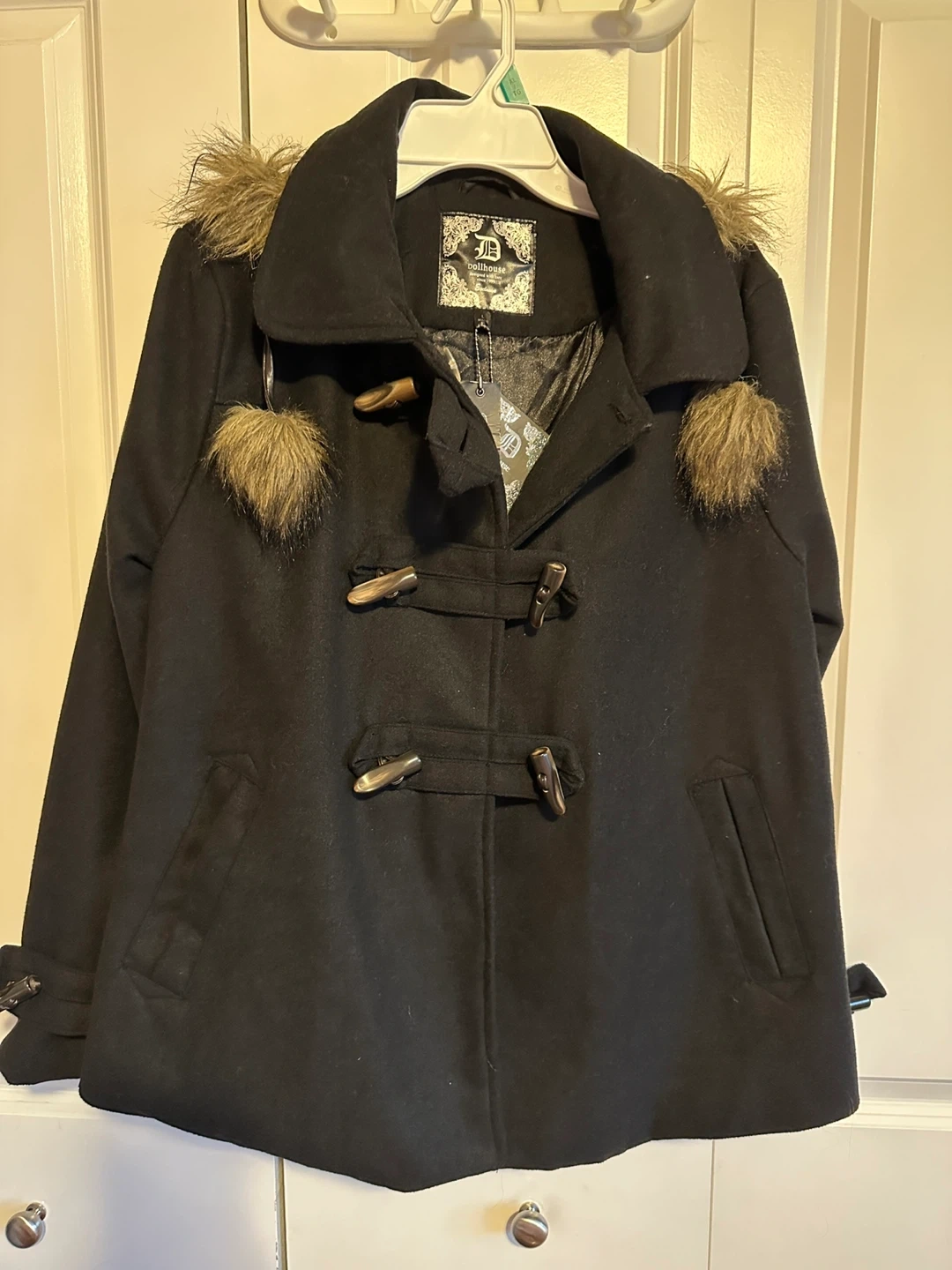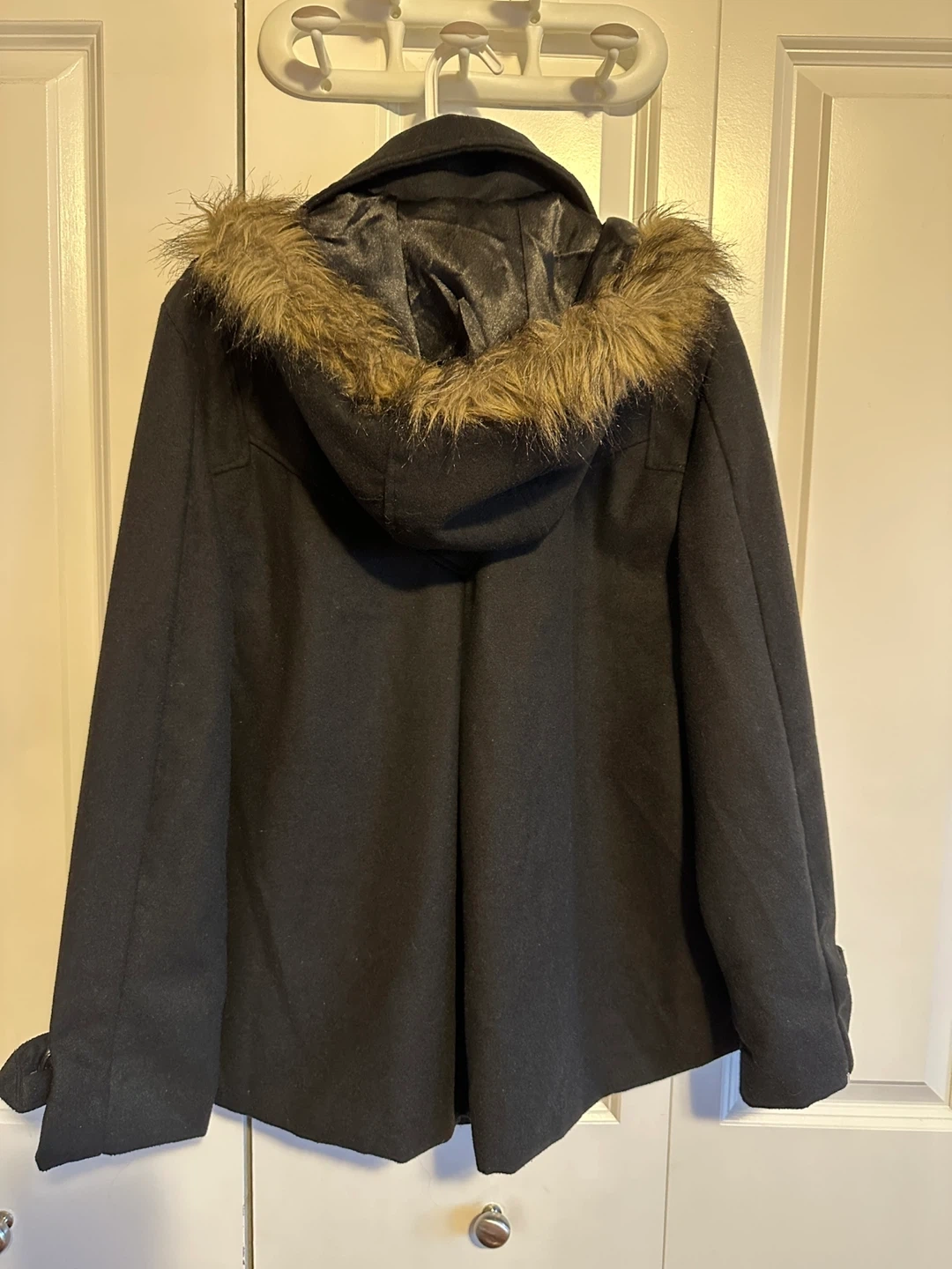 Cute black coat from Dollhouse! It features a hood with faux fur trim and a toggle closure. It's in great condition!