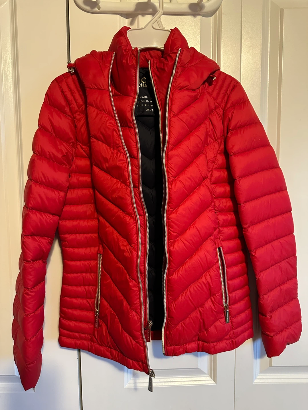 This is a stylish Michael Kors red packable puffer jacket. It's in good condition as shown in the photos. Perfect for staying warm and fashionable!