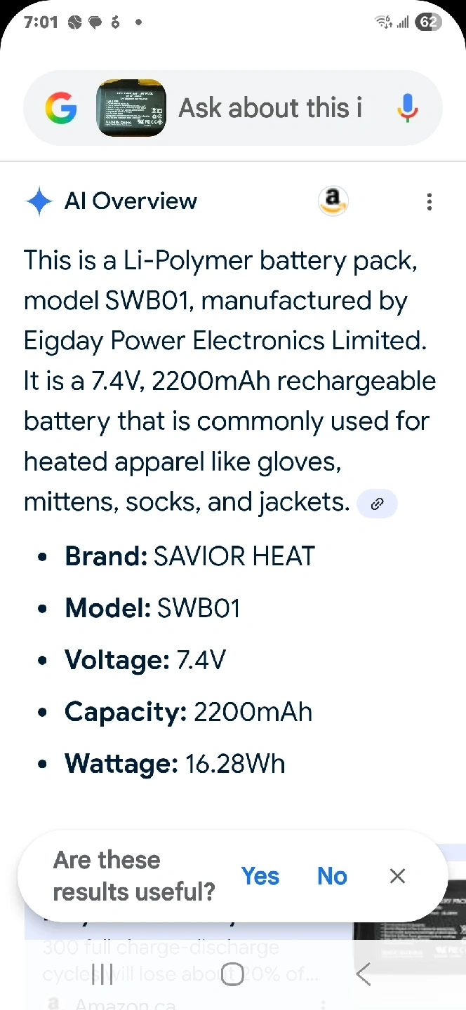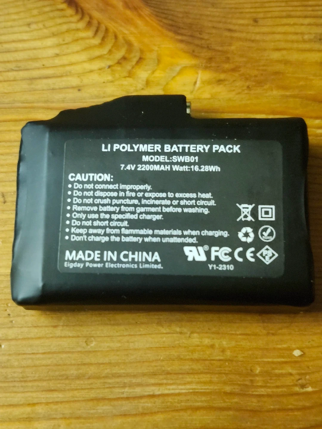 Selling a Savior Heat Li-Polymer battery pack, model SWB01. It's a 7.4V, 2200mAh rechargeable battery commonly used for heated apparel like gloves, mittens, socks, and jackets