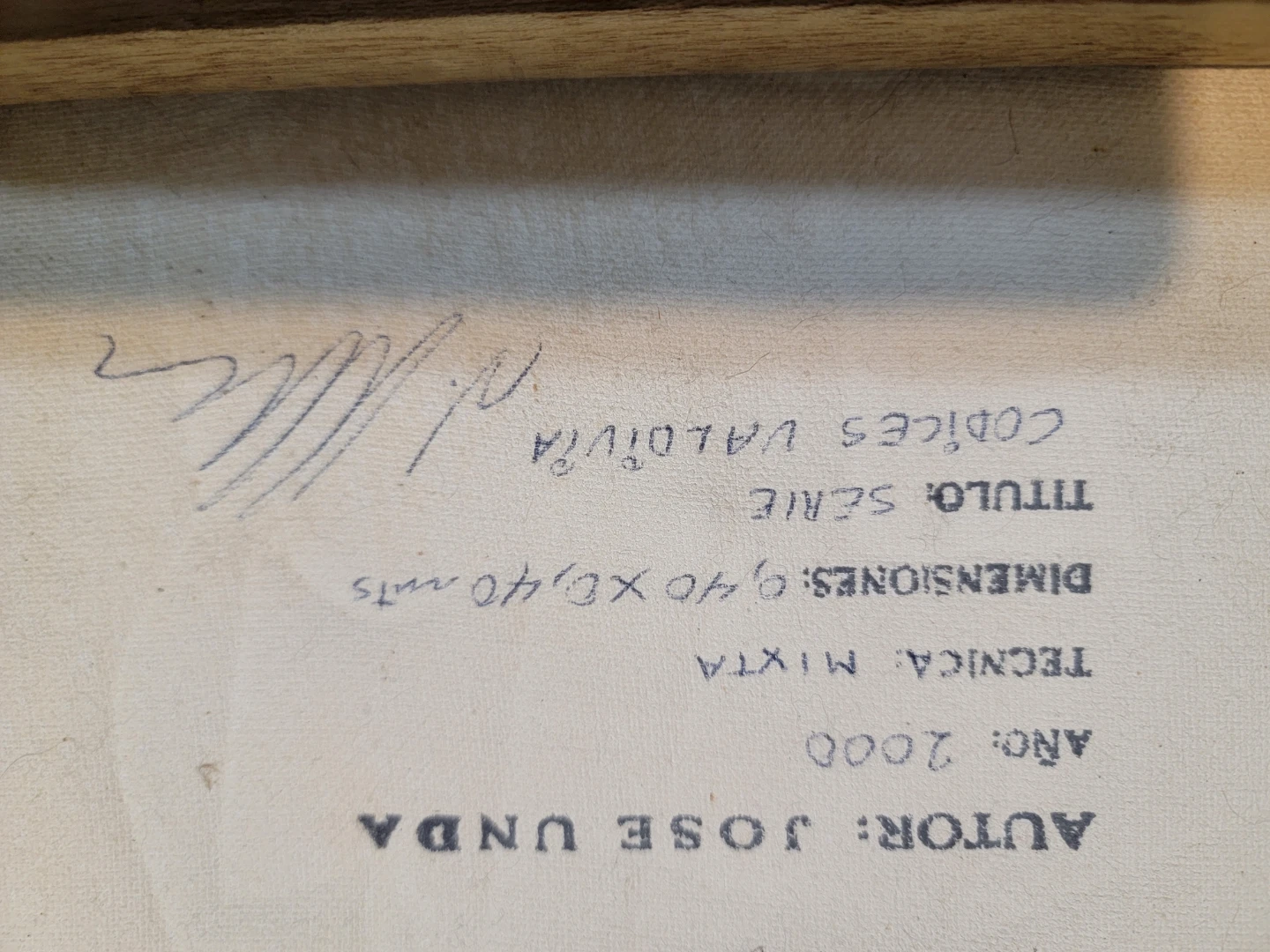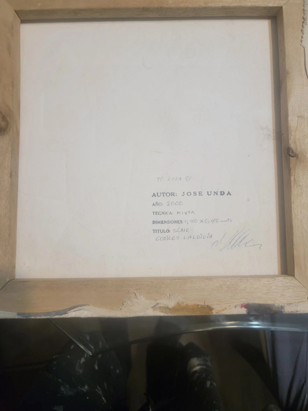 Selling an original painting by Jose Unda, titled "Codices Valdivia"! The artwork uses a mixed media technique on canvas and measures 40 x 40 cm. This piece was created in the year 2000 and would make a great addition to any art collection