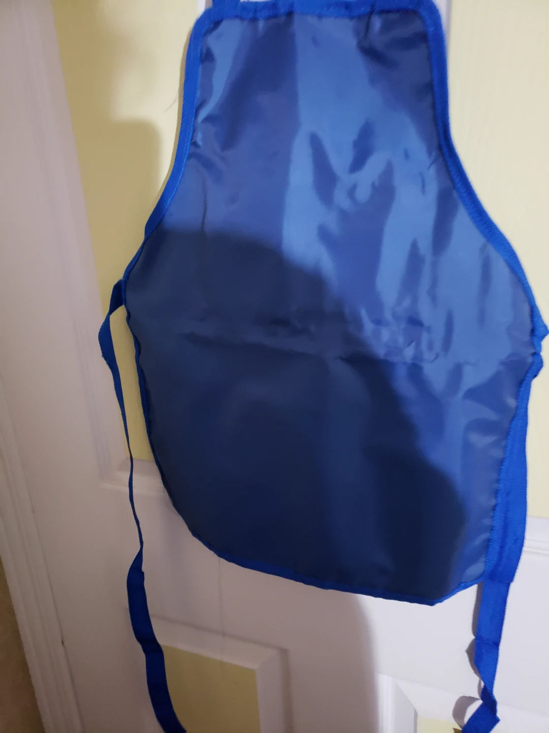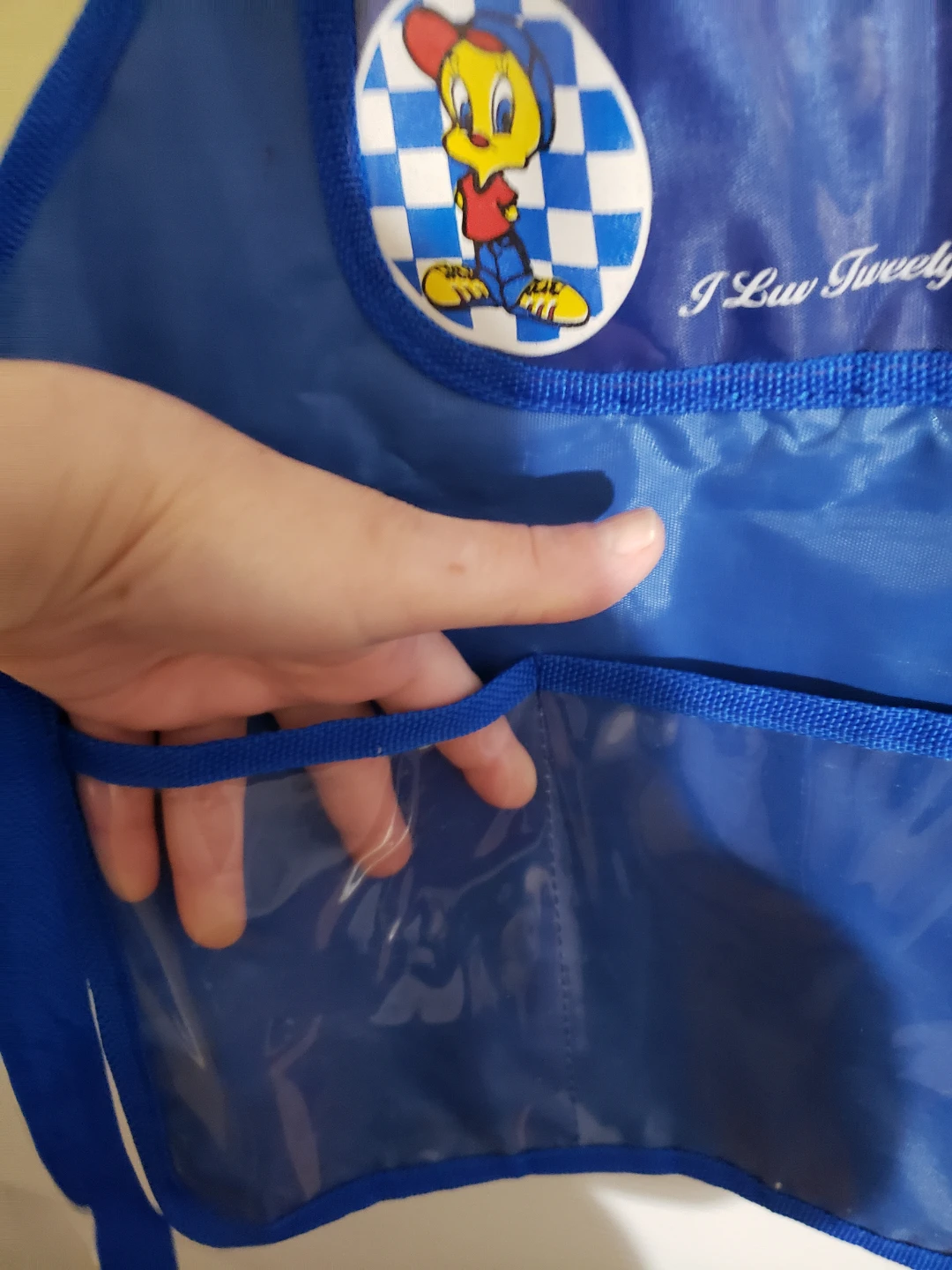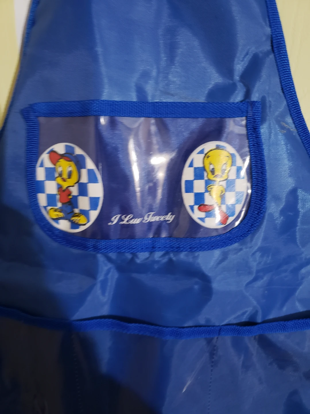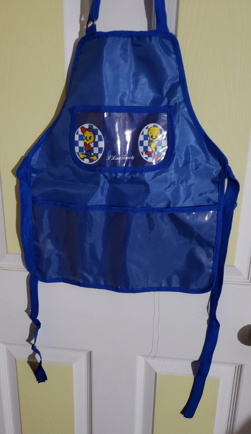 A cute blue apron for kids featuring Tweety Bird! It has a 4 pockets in the front for holding art supplies or little treasures adjustable neck strip