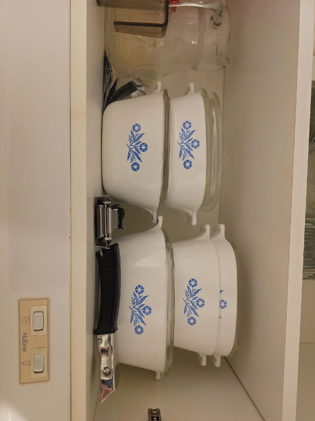 Selling a set of vintage CorningWare casserole dishes! They feature the classic white finish with a delicate blue floral pattern. These dishes are perfect for baking and serving, and they add a touch of retro charm to any kitchen