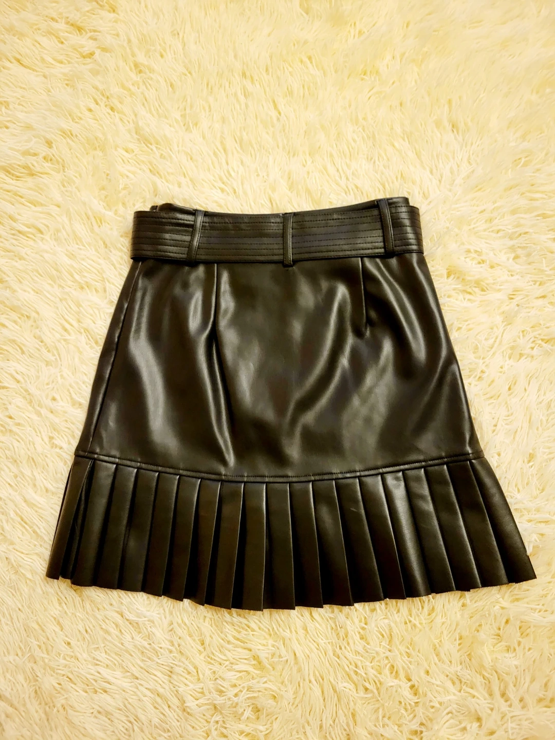 Check out this stylish black faux leather mini skirt! It features a pleated hem and a belted waist with a round buckle. Perfect for adding a bit of edge to your wardrobe!