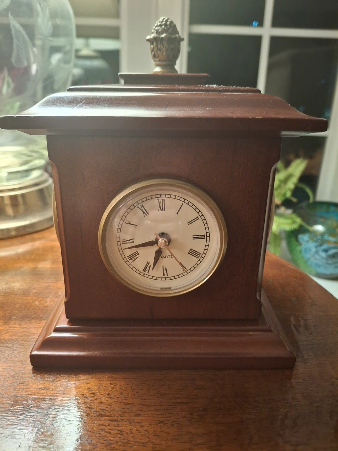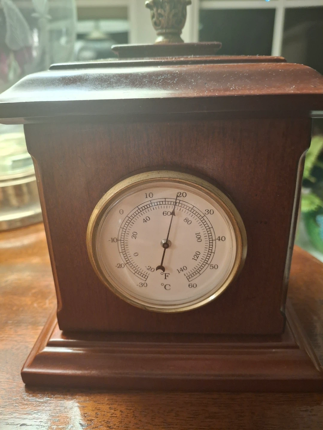 Vintage Bombay Company Clock/Thermometer/Barometer/Hygrometer. Rotates. Approx 7.5” high by 5.5” across base. Very good condition.