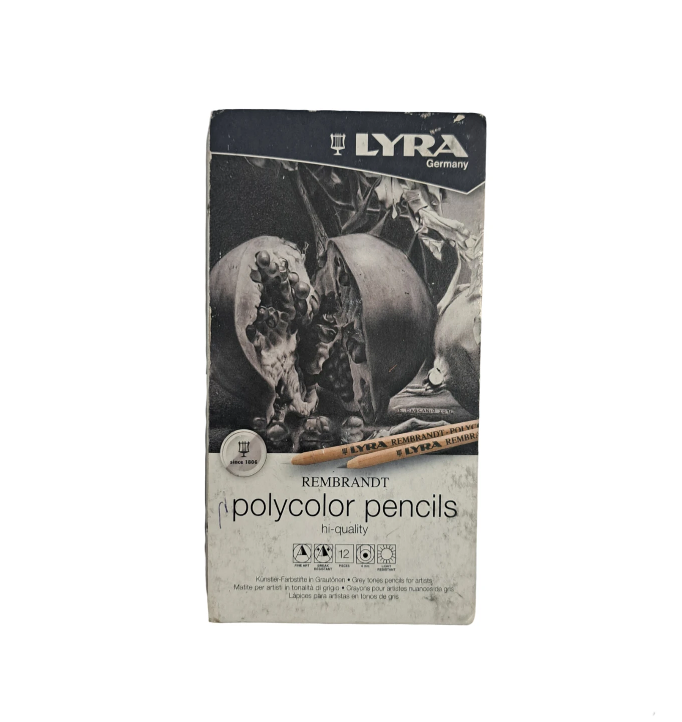 This is a set of used Lyra Rembrandt Polycrayon pencils in grey tones for artists. They're perfect for adding subtle shades and highlights to your drawings. The set includes 10 pencils with 2 of them missing in a tin case, ideal for both beginners and experienced artists. These pencils have been lightly loved and are in good condition, ready to bring your artistic visions to life.