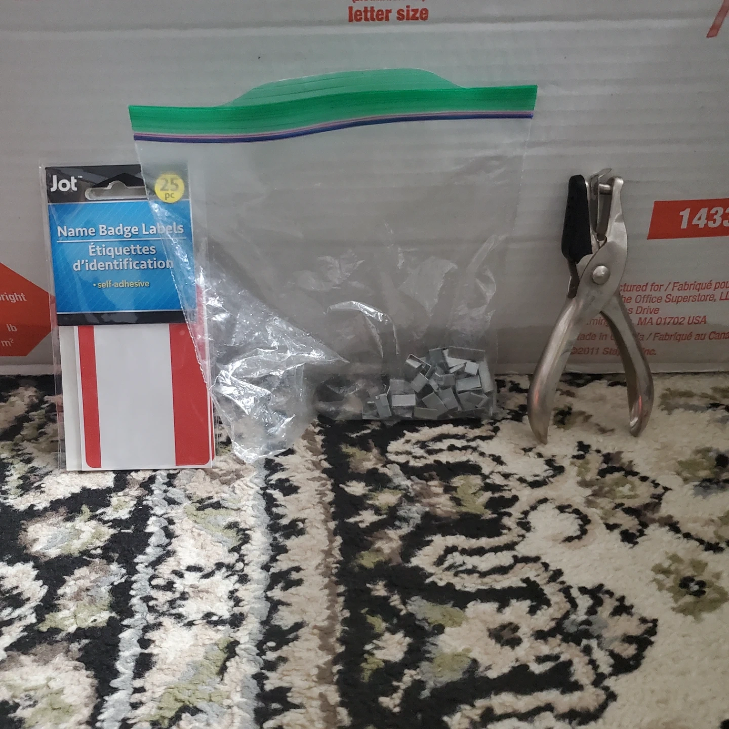Selling a pack of Jot name badge labels and a hole punch. Great for organizing or crafting! Also some staples.