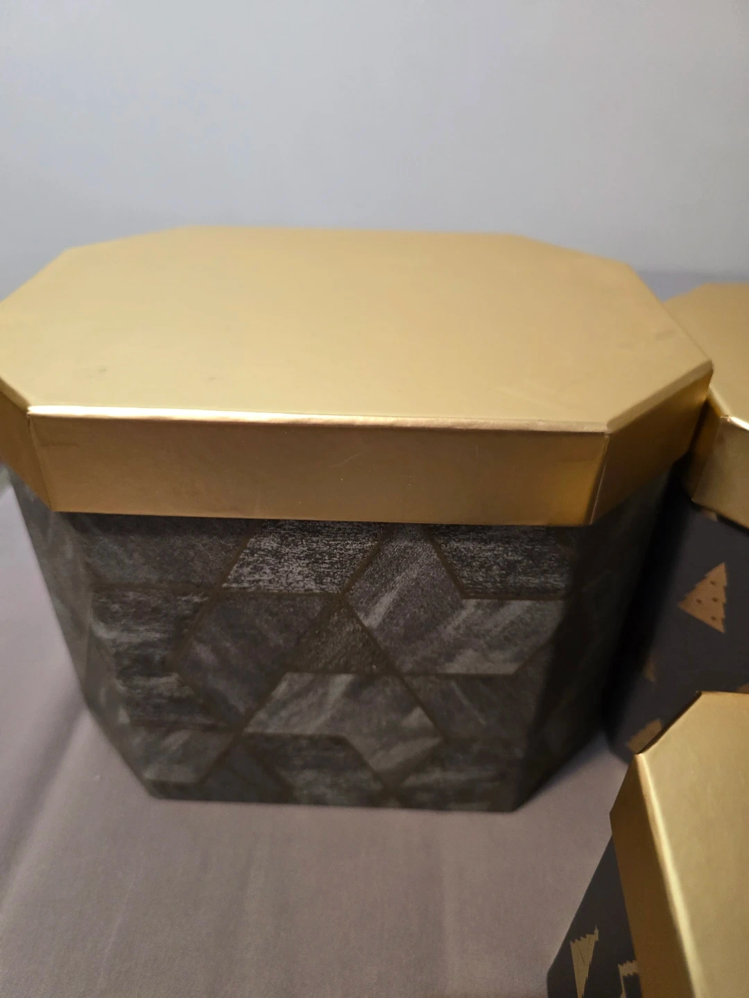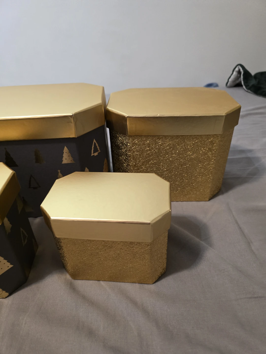 Here's a set of 5 decorative nesting boxes! They come in different sizes and designs, perfect for adding a touch of sparkle to your home decor