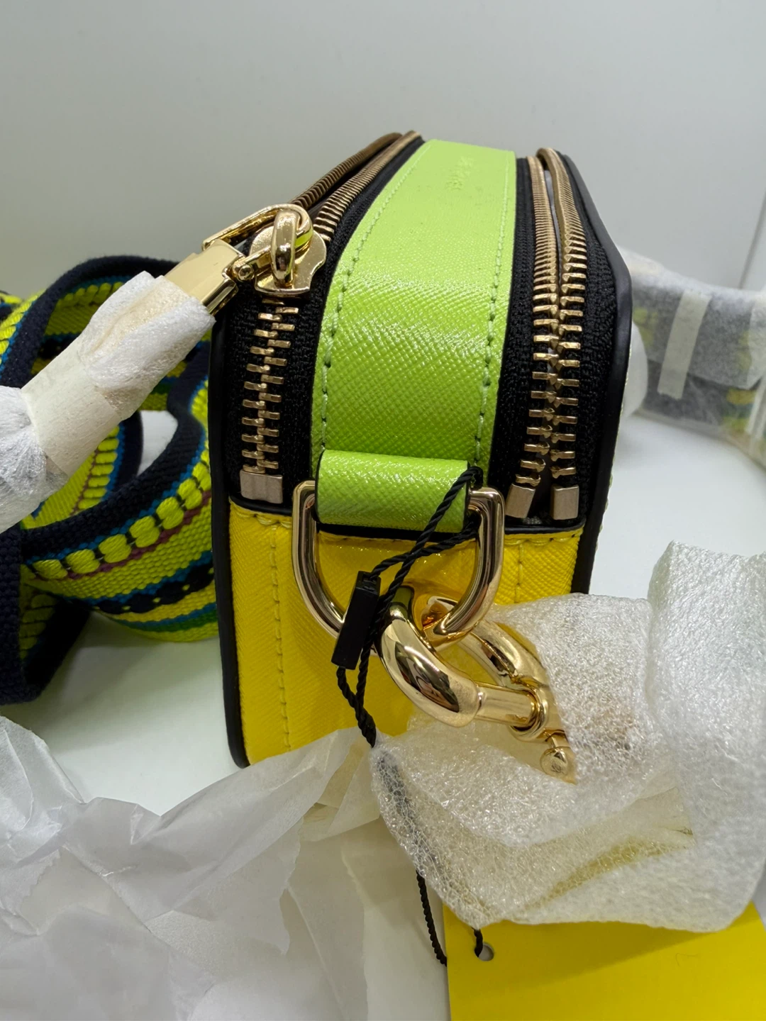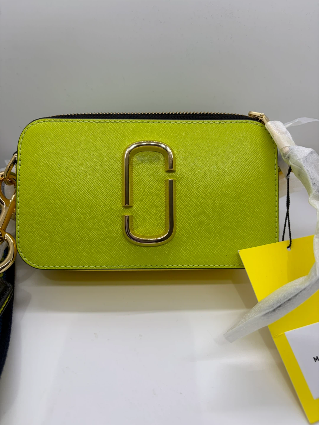 This is a brand new Marc Jacobs Snapshot crossbody bag! It features a vibrant lime color with a stylish, patterned strap. Perfect for adding a pop of color to any outfit!