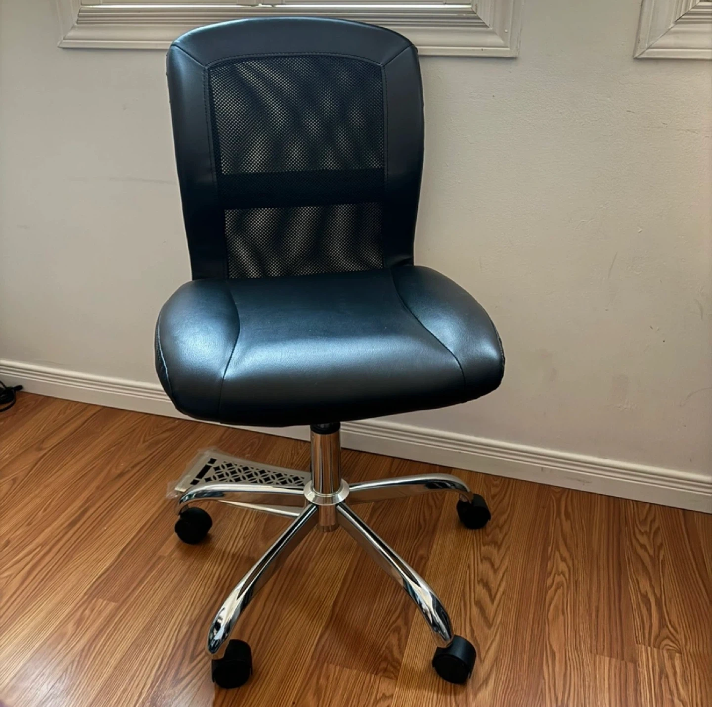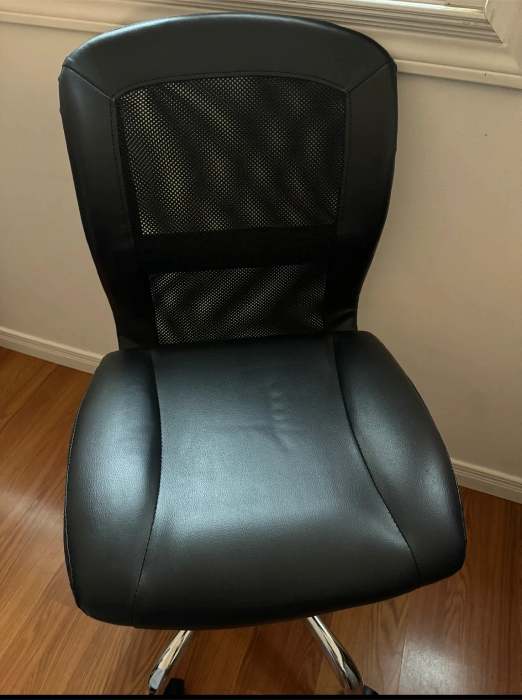 Selling a comfortable black office chair! It features a mesh back for breathability and a sleek design that fits well in any workspace. It's in great condition and ready to use in your home or office