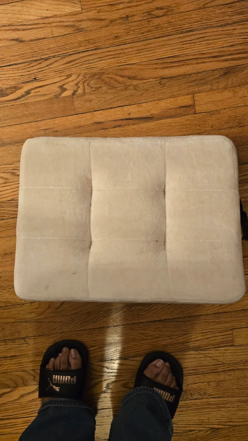 Selling a comfy white tufted ottoman! It's in good condition and perfect for resting your feet or as extra seating.