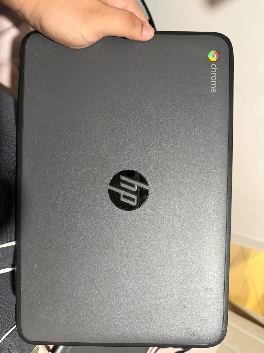 Selling a used HP Chromebook. It's in good condition and perfect for schoolwork or browsing the web. It has a black color and the Chrome logo on the cover. It also has ports for HDMI, USB, and SD cards
