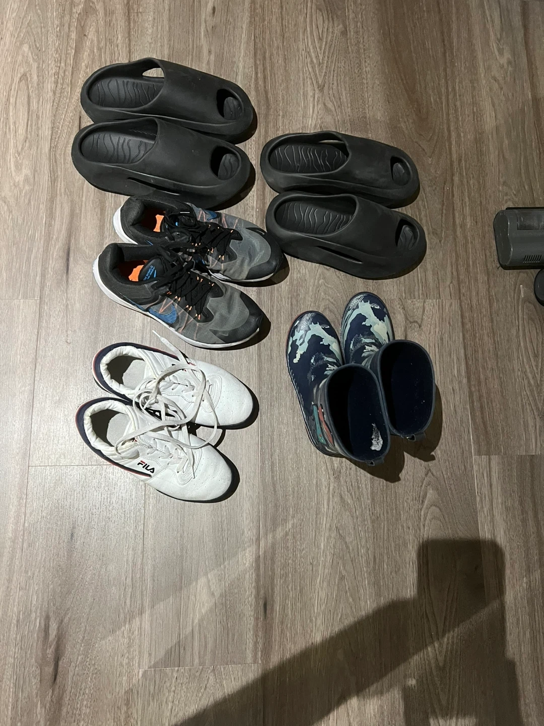 14Selling a variety of shoes! There are Fila sneakers, Nike running shoes, black slides, and some rain boots. All are in used condition.