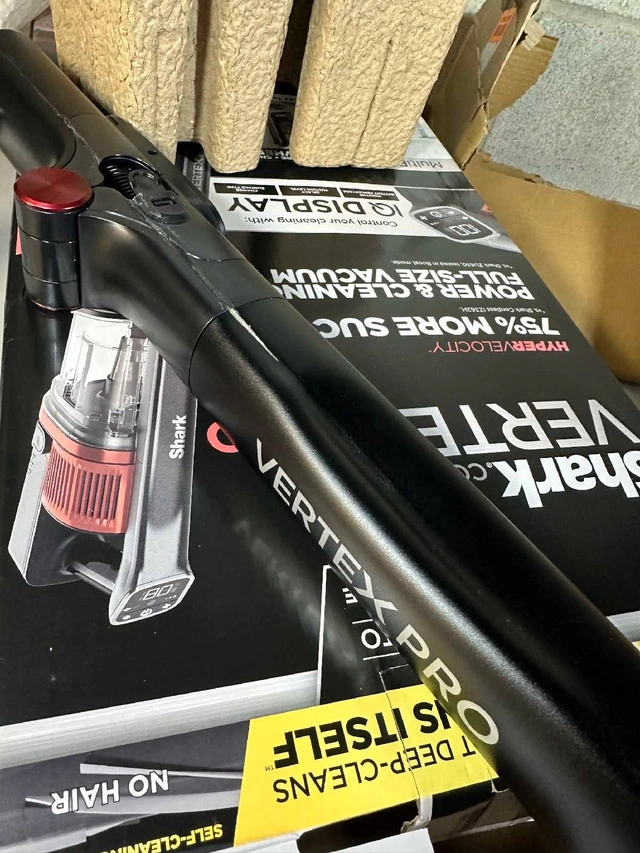 68New Shark cordless stick vacuum cleaner with DuoClean PowerFins, HEPA filter, and up to 60min runtime. It's foldable and lightweight. There is a minor transportation scratch on the handle (as shown in the photos). This is cosmetic only and does not affect the vacuum’s functionality or performance. Key Features: Full-Size Power, Cordless Freedom: Delivers the suction and cleaning performance of a full-size upright vacuum — all without the cord. Long-Lasting Battery: Removable lithium-ion battery provides up to 60 minutes of runtime. DuoClean PowerFins Technology: Combines a soft front roller to pull in fine dust with PowerFins that dig deep into carpets and floors. Self-Cleaning Brushroll: Effortlessly picks up pet hair and prevents hair wrap — perfect for pet owners. MultiFLEX Technology: The flexible wand reaches under furniture easily and folds for freestanding storage. IQ Display: Real-time digital display shows runtime, performance status, and battery life. 2-in-1 Versatility: Quickly transforms into a handheld vacuum for stairs, furniture, and car interiors. Advanced HEPA Filtration: Captures dust, dander, and allergens — ideal for allergy sufferers. LED Headlights: Illuminate hidden debris on floors and in corners. Easy-Empty Dust Cup: CleanTouch Dirt Ejector allows hands-free dirt disposal. Package Includes: Shark Cordless Stick Vacuum Removable Battery Charging Dock HEPA Filter (Installed) Accessories (Brush / Crevice Tool) User Manual