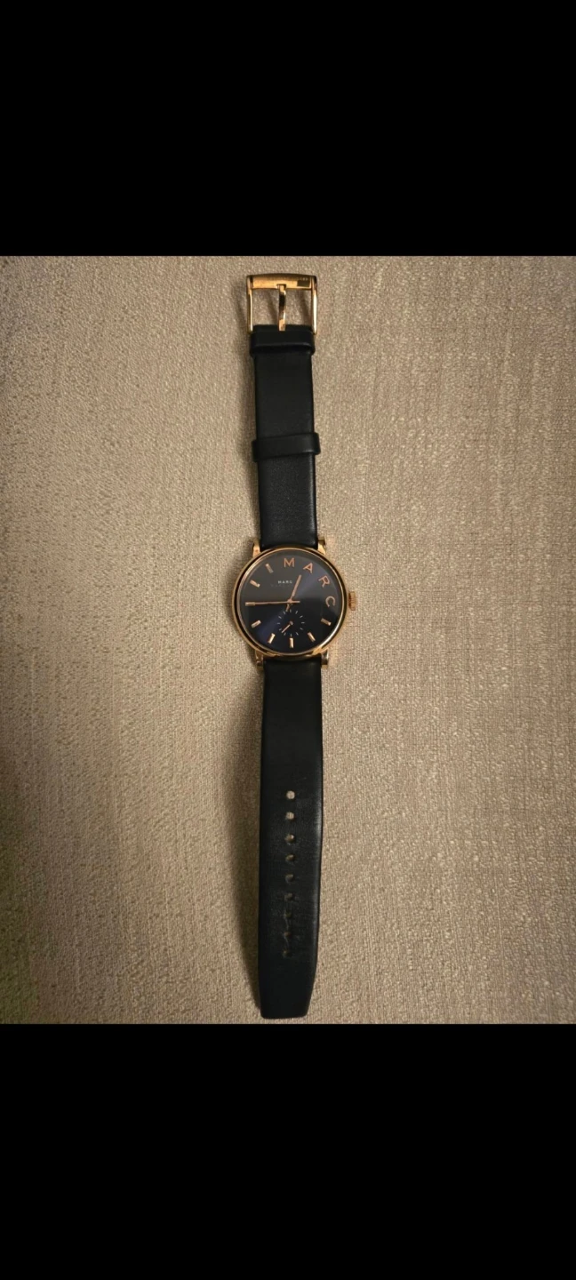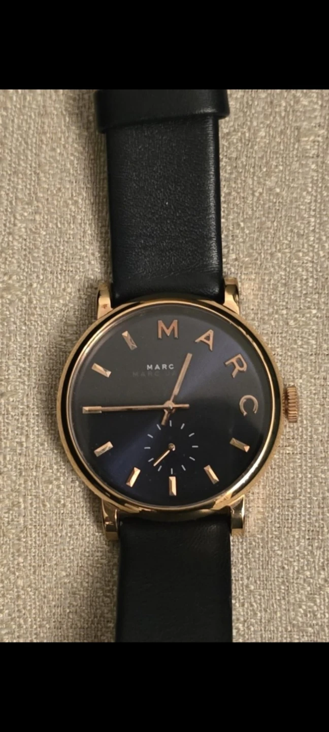 Selling a Marc Jacobs ladies' watch. The watch has a black leather strap and a rose gold-tone case. It's in great condition.