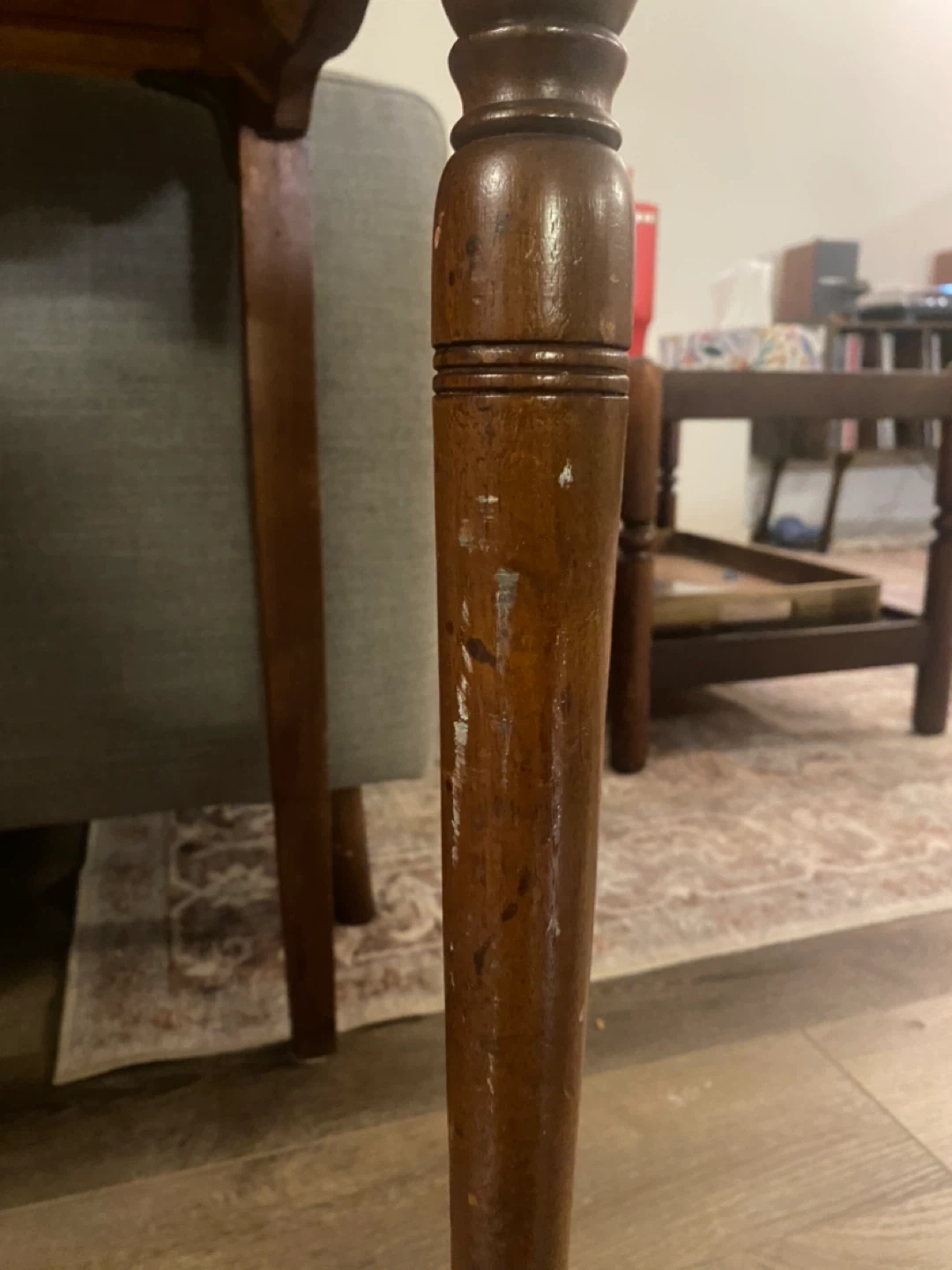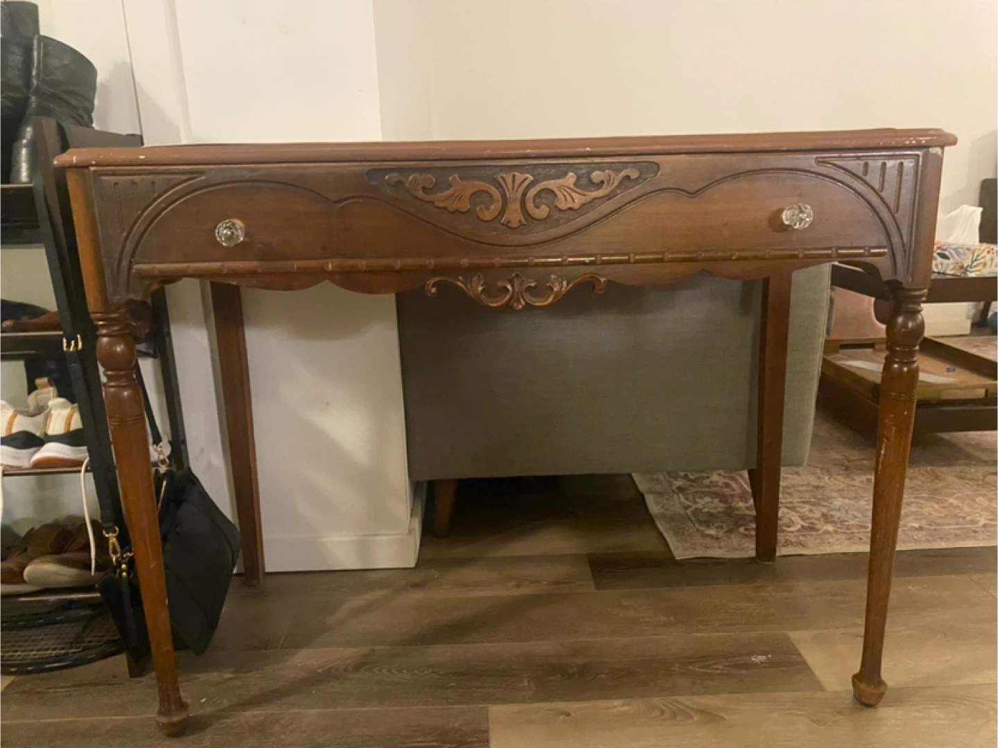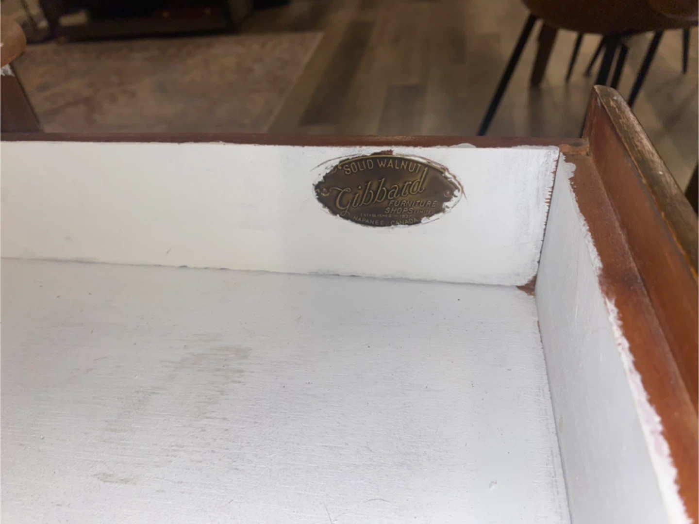 Selling a Gibbard solid walnut desk. Got it in a furniture bundle with my apartment, unfortunately someone painted the table top and in the drawers. Feels like acrylic paint. Has lots of wear on the legs. Selling because I got a bigger desk. Pickup only!