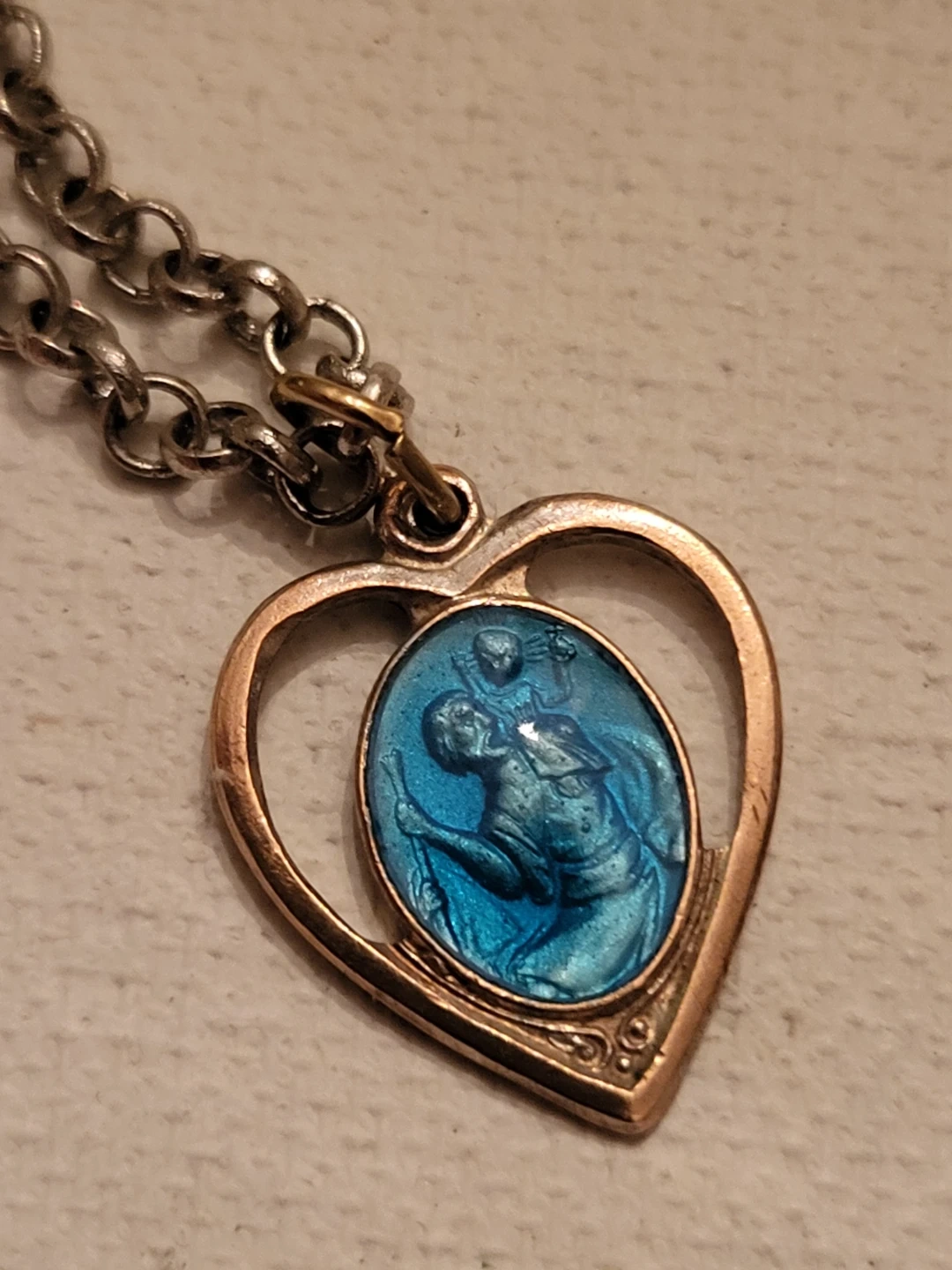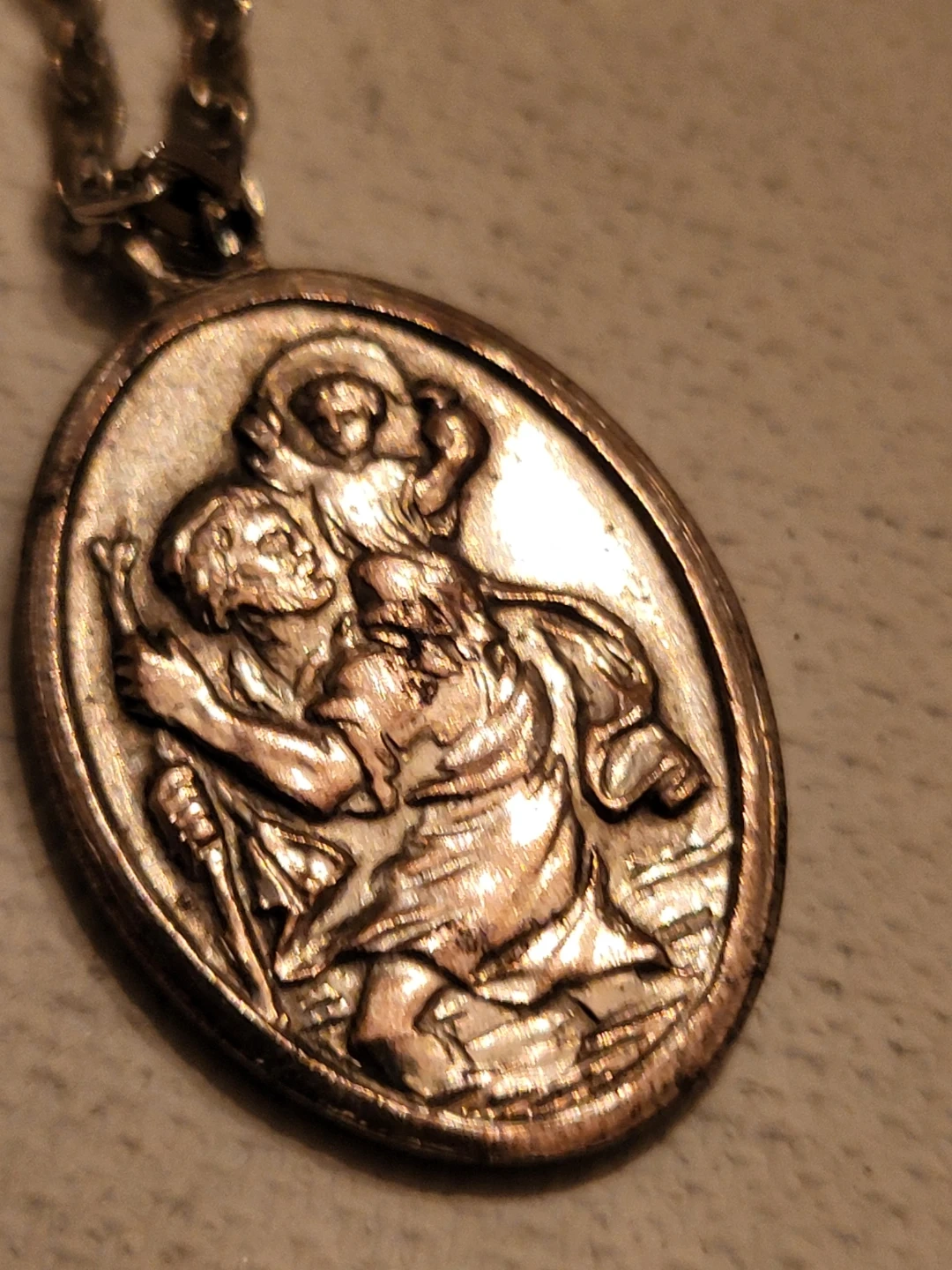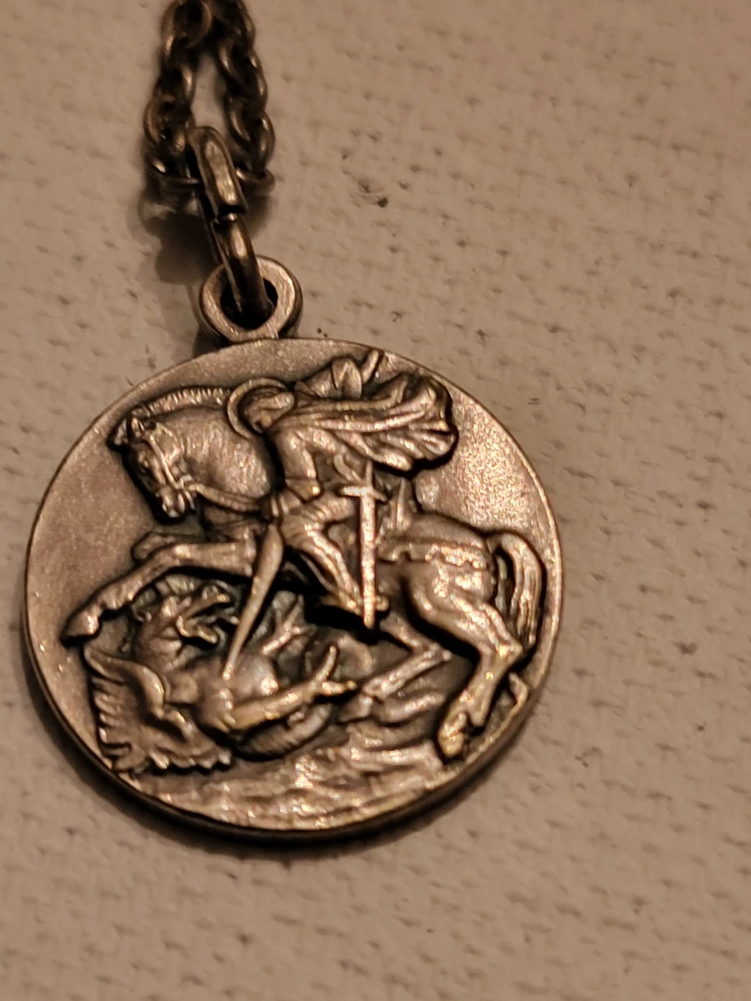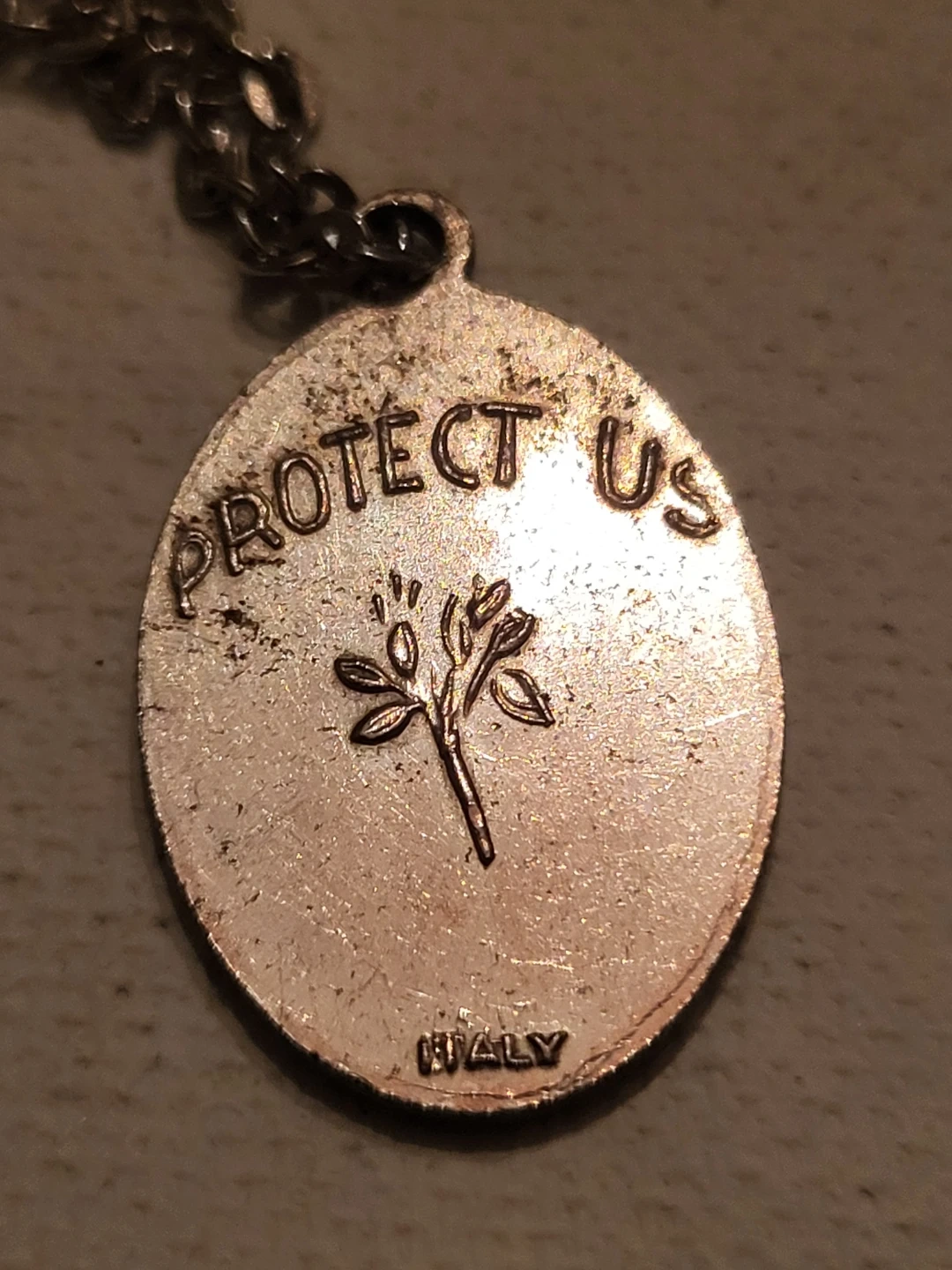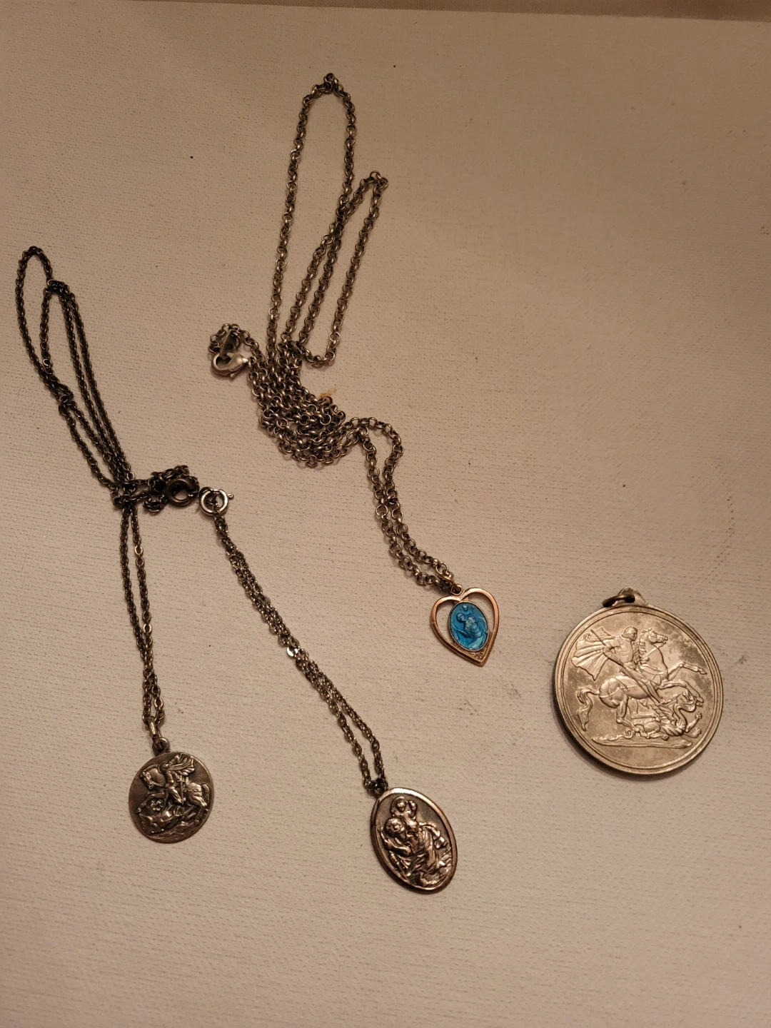 134Selling a set of 2 vintage religious medallion necklaces, 1 braclet and a extra pendant coin. Each piece features a unique design. Perfect for collectors or those who appreciate vintage religious jewelry!