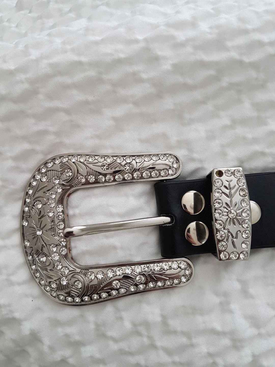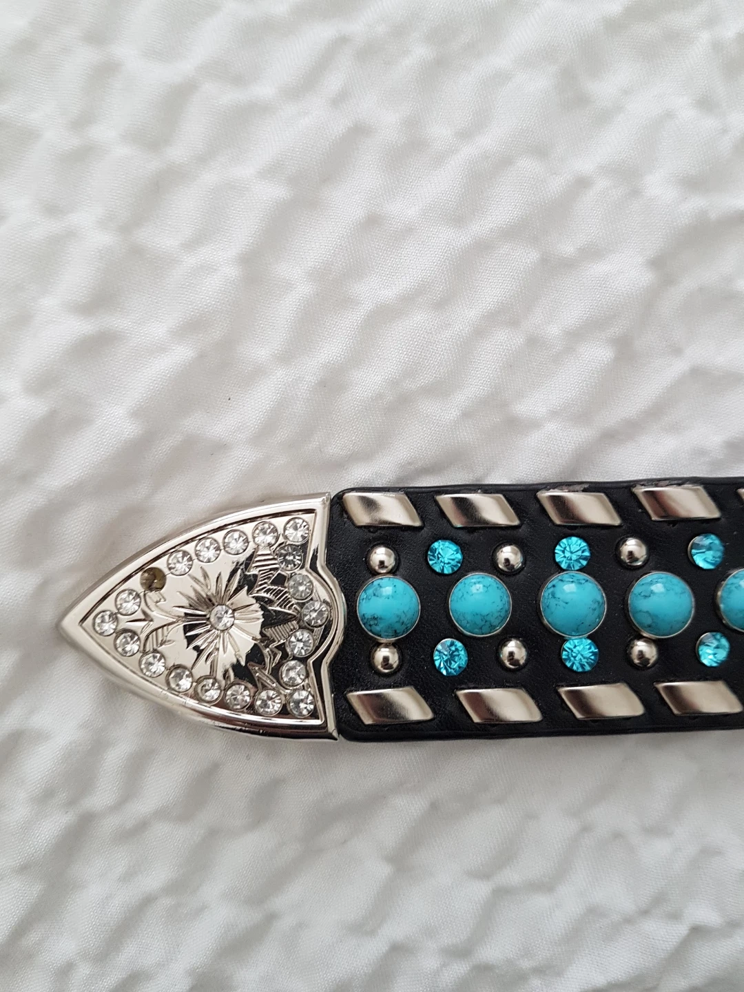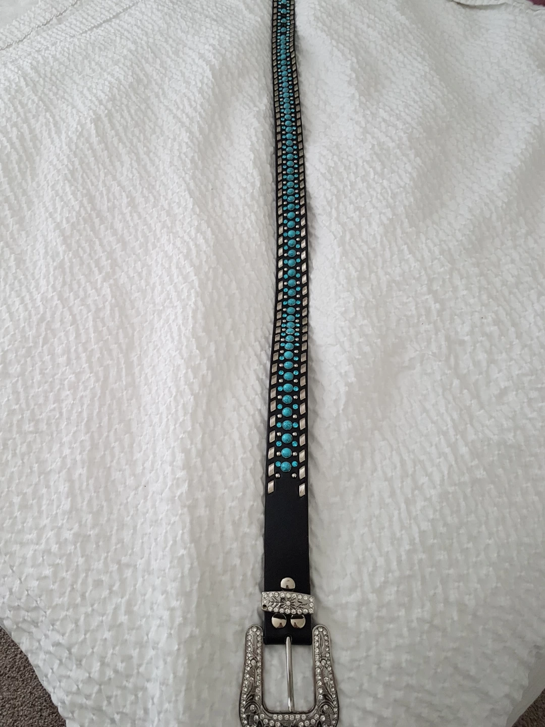 Firm in price. Selling a stylish belt with a rhinestone and turquoise design! It's made of genuine leather and is a size ML. Perfect for adding a bit of sparkle to any outfit. Please also check out my other listings on this account. This is a no pet/ smoke home. Pick Up Cochrane, Alberta