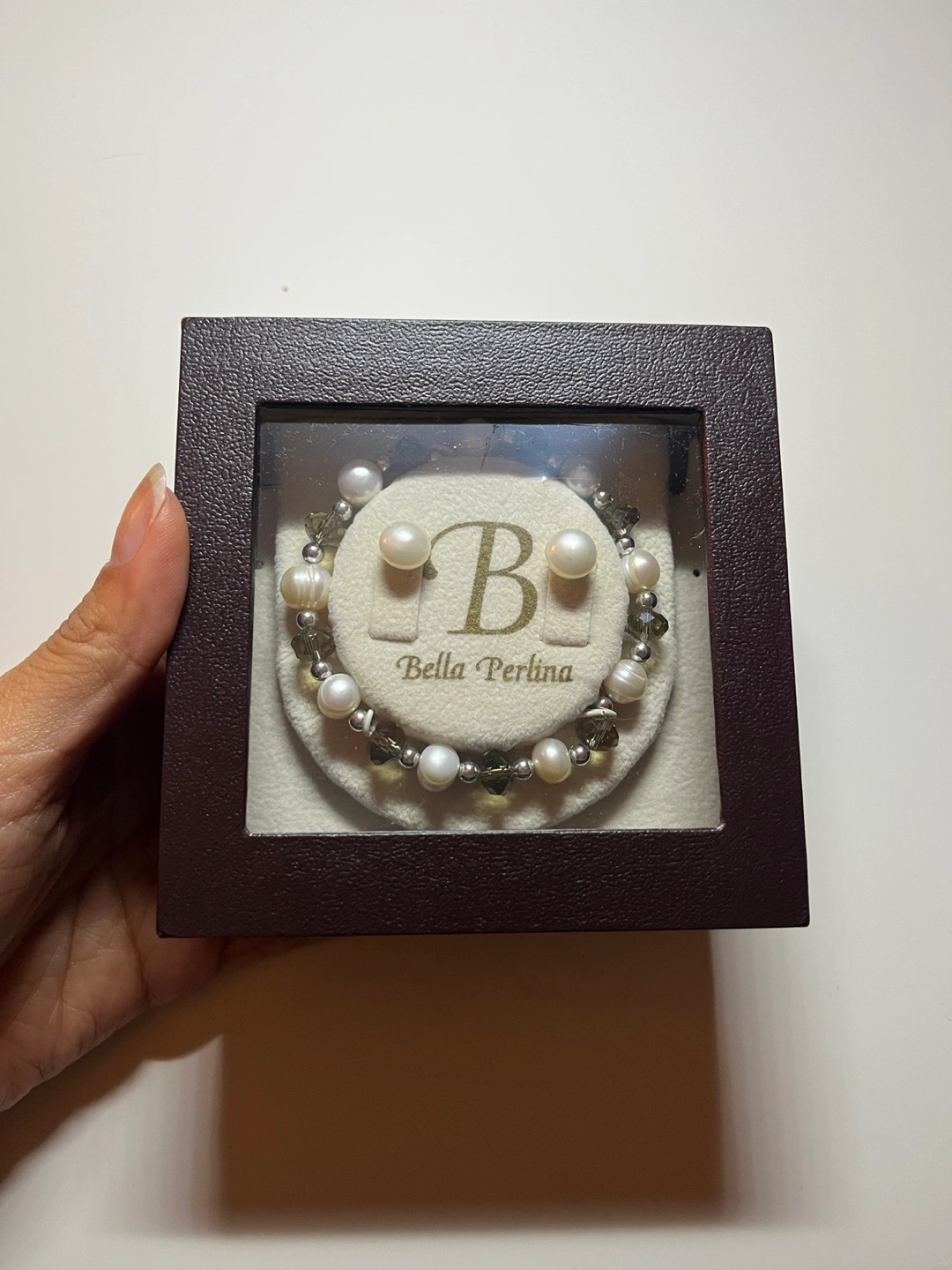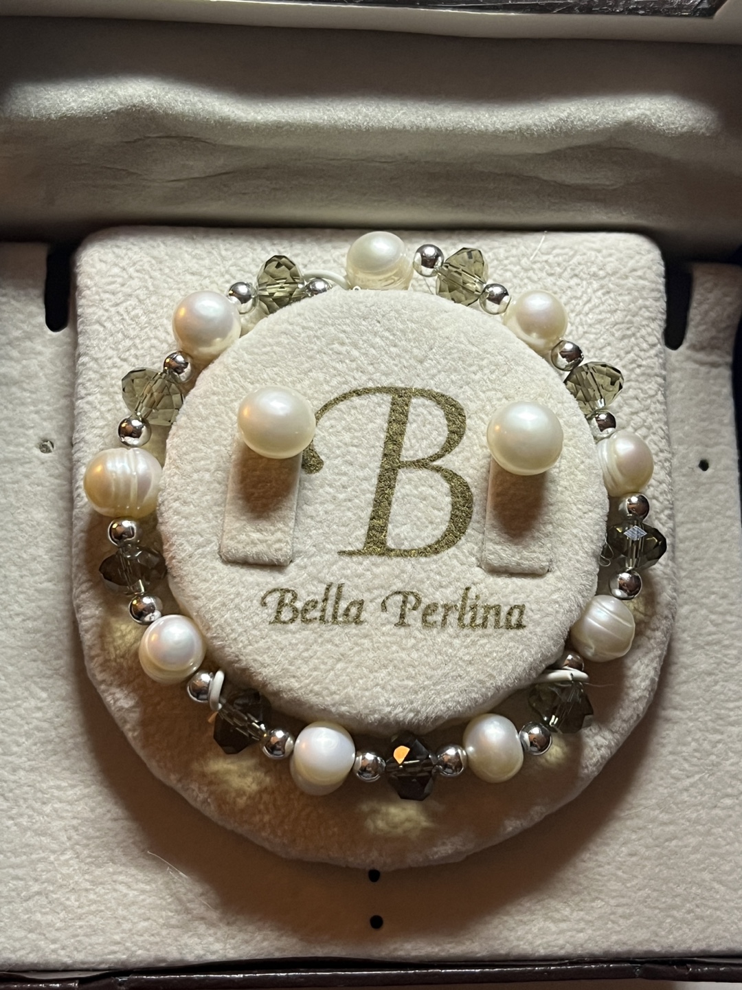 This is a beautiful Bella Perlina set featuring a bracelet and matching earrings. The set is made with genuine freshwater pearls and other beads. It comes in its original box, making it perfect for gifting or keeping for yourself